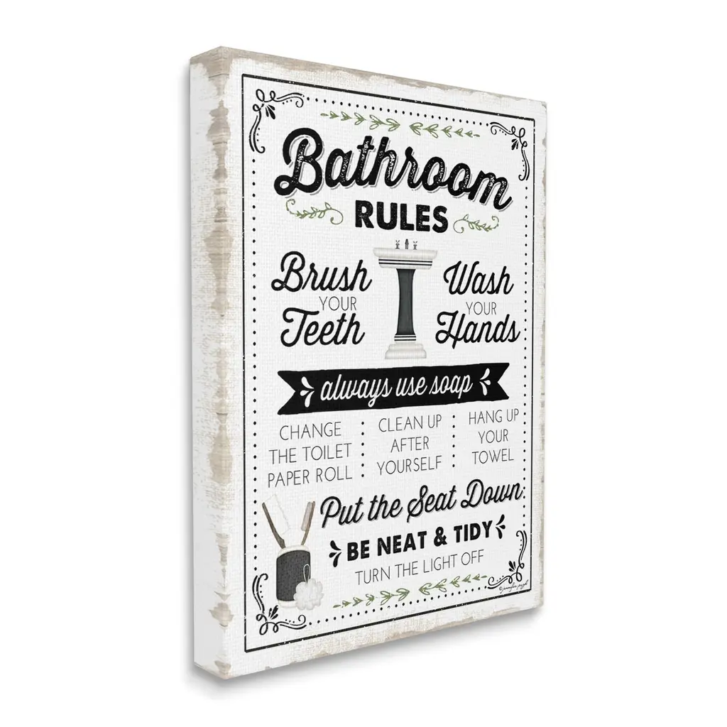 We create our stretched canvas to the highest standards. Using only the highest quality inks and canvas on Mimaki printers, we hand-cut and stretch each piece over a 1.5-inch thick wooden frame for hanging. As a result, the art comes ready to hang on the sturdy ledge with no installation required. Stupell Wall Art is made in the USA.Features: Dimensions: 16 x 1.5 x 20 InchesStretched Canvas Sizes Include Standard: 16 x 1.5 x 20 Large: 20 x 1.5 x 30 X-Large: 30 x 1.5 x 40 Oversized: 36 x 1.5 x 48Wall Art is Ready to Hang - No Installation or Hardware Needed. For Easy Set Up Lean or Layer Artwork on Shelf or Against Wall.Our stretched canvas is created with the highest standards. We use only the highest quality inks and canvas on our in house Mimaki printers, and then hand cut and stretch each piece over a 1.5 inch thick wooden frame for hanging. Made In USA.Artwork Relates To: Rules, Bathroom, Sign, Vintage, Rustic, Bathroom RulesDesign by Jennifer Pugh