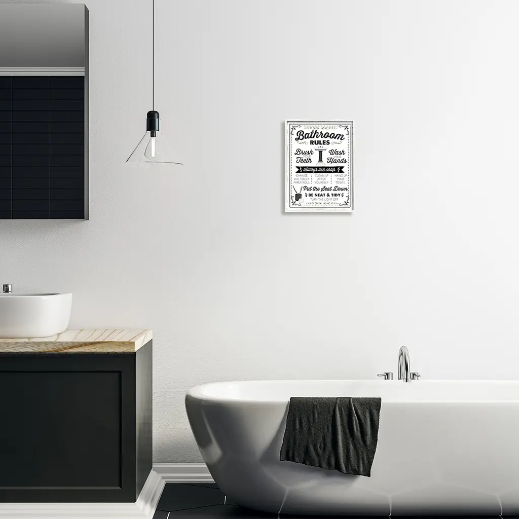 Add dimension to any room with our textured Framed Giclee Artwork. Our framed artwork is securely mounted into a 1.5-inch thick wood grain frame and ready to hang. Frames are available in three alluring styles: black, gray farmhouse and white. In addition, you should check out our oversized options if you want a statement piece. Stupell Wall Art is made in the USA.Features: Dimensions: 11 x 1.5 x 14 FramedFramed Giclee Sizes Include Standard: 11 x 1.5 x 14 Large: 16 x 1.5 x 20 Oversized: 24 x 1.5 x 30Wall Art is Ready to Hang - No Installation or Hardware Needed. For Easy Set Up Lean or Layer Artwork on Shelf or Against Wall.Our giclée prints are carefully mounted on a durable MDF backing, and then perfectly finished in a 1.5 inch thick woodgrain frame. Mounted frame colors include black, gray farmhouse and white. Made In USA.Artwork Relates To: Rules, Bathroom, Sign, Vintage, Rustic, Bathroom RulesDesign by Jennifer Pugh