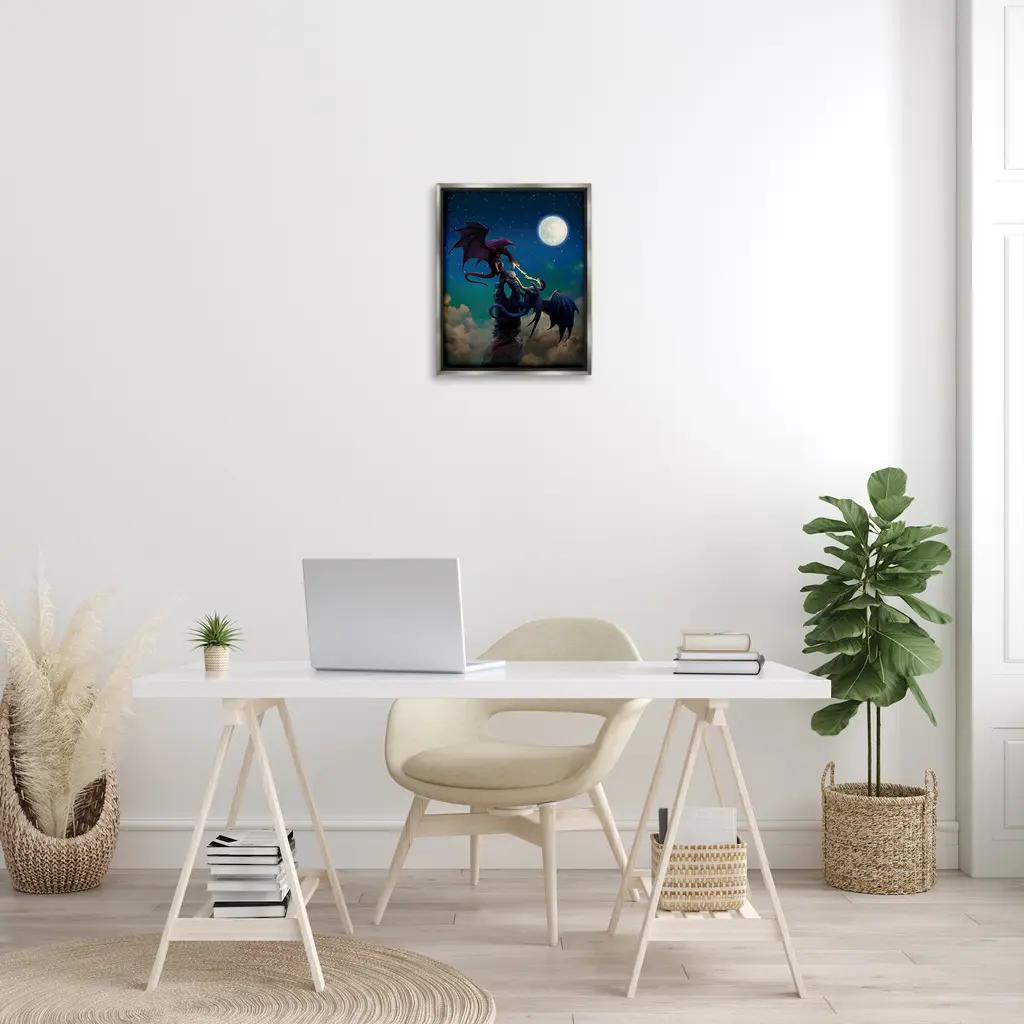 Elevate your home or office to the next level with Stupell Framed Floating Canvas Wall Art. Our premium hand-stretched canvas is mounted securely into a sturdy lightweight frame. The museum-style gap between the wrapped canvas and the box frame gives the illusion of floating artwork. Stupell Wall Art is made in the USA.Features: Dimensions: 17 x 1.7 x 21 Frame, 16 x 1.5 x 20 Canvas ArtFloating Frame Canvas Products are available in sizes 17"x21" and 25"x31". All Floating Frame Canvas Products have a 1.7" Depth.Wall Art is Ready to Hang with Hardware Free Hanging. No Installation required. For Easy Set Up Lean or Layer Artwork on Shelf or Against Wall. Artwork is Permently Fixed into the Frame.Our elevated 1.7" Thick Floating Frame is the perfect complement to our canvas style Wall Art. We use only the highest quality inks in house with industry leading printing solutions. Canvas is hand stretched over a durable wood foundation and then mounted securly into a Modern Box Frame. Made in the USA.Artwork Relates To: Dragon, Animal, Reptile, Landscape, Surreal, Fantasy, Magical, Clouds, Moon, Fog, CliffDesign by Ciruelo