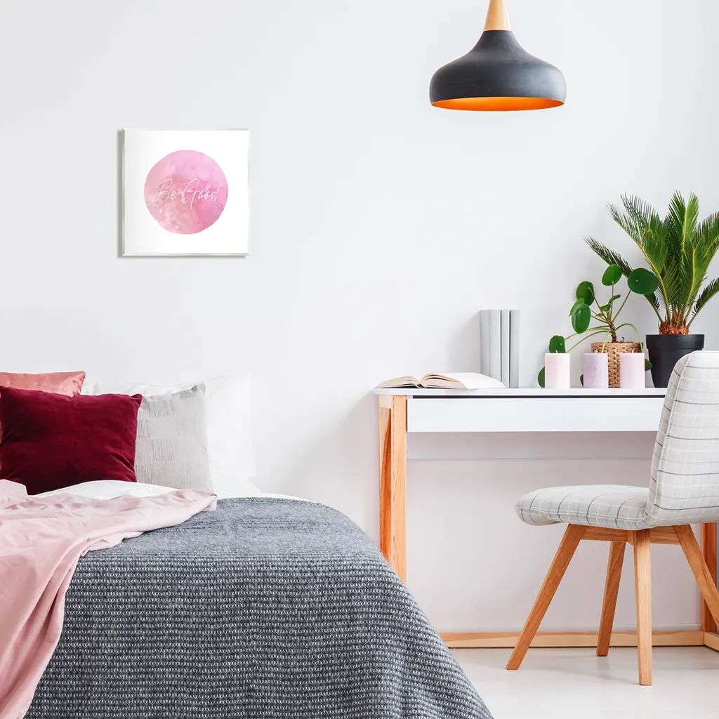 Our wall plaques start as high-quality lithograph prints mounted on durable 0.5-inch thick MDF wood. Each piece is hand finished and comes with a fresh layer of white foil on the sides to give it a crisp, clean look. Plaques arrive ready to hang without installation and come with removable plastic corners to keep them from damage in transit. Stupell Industries Wall Art is made in the USA.Features: Dimensions: 12 x 0.5 x 12 InchesWall Art is Ready to Hang with Hardware Free Hanging. No installation required. For Easy Set Up Lean or Layer Artwork on Shelf or Against Wall.All of our wall plaques start off as high quality lithograph prints that are then mounted on durable 0.5 inch thick MDF wood. Each piece is hand finished and comes with a fresh layer of foil on the sides to give it a crisp clean look. Made In USA.Artwork Relates To: Phrase, Simple, Pink, Circle, Be GoodDesign by Christine Zalewski