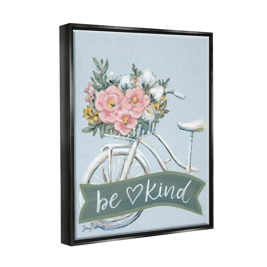 Elevate your home or office to the next level with Stupell Framed Floating Canvas Wall Art. Our premium hand-stretched canvas is mounted securely into a sturdy lightweight frame. The museum-style gap between the wrapped canvas and the box frame gives the illusion of floating artwork. Stupell Wall Art is made in the USA.Features: Dimensions: 17 x 1.7 x 21 Frame, 16 x 1.5 x 20 Canvas ArtFloating Frame Sizes Include Standard: 17 x 1.7 x 21 Oversized: 25 x 1.7 x 31Wall Art is Ready to Hang with Hardware Free Hanging. No installation required. For Easy Set Up Lean or Layer Artwork on Shelf or Against Wall.Our elevated 1.7" Thick Floating Frame is the perfect complement to our canvas style Wall Art. We use only the highest quality inks in house with industry leading printing solutions. Canvas is hand stretched over a durable wood foundation and then mounted securly into a Modern Box Frame. Made in the USA.Artwork Relates To: Floral, Pattern, Flower, Flower Arrangement, Plant, Flower Bouquet, Rose, Transportation, Bicycle, Petal, Be KindDesign by Sara Baker