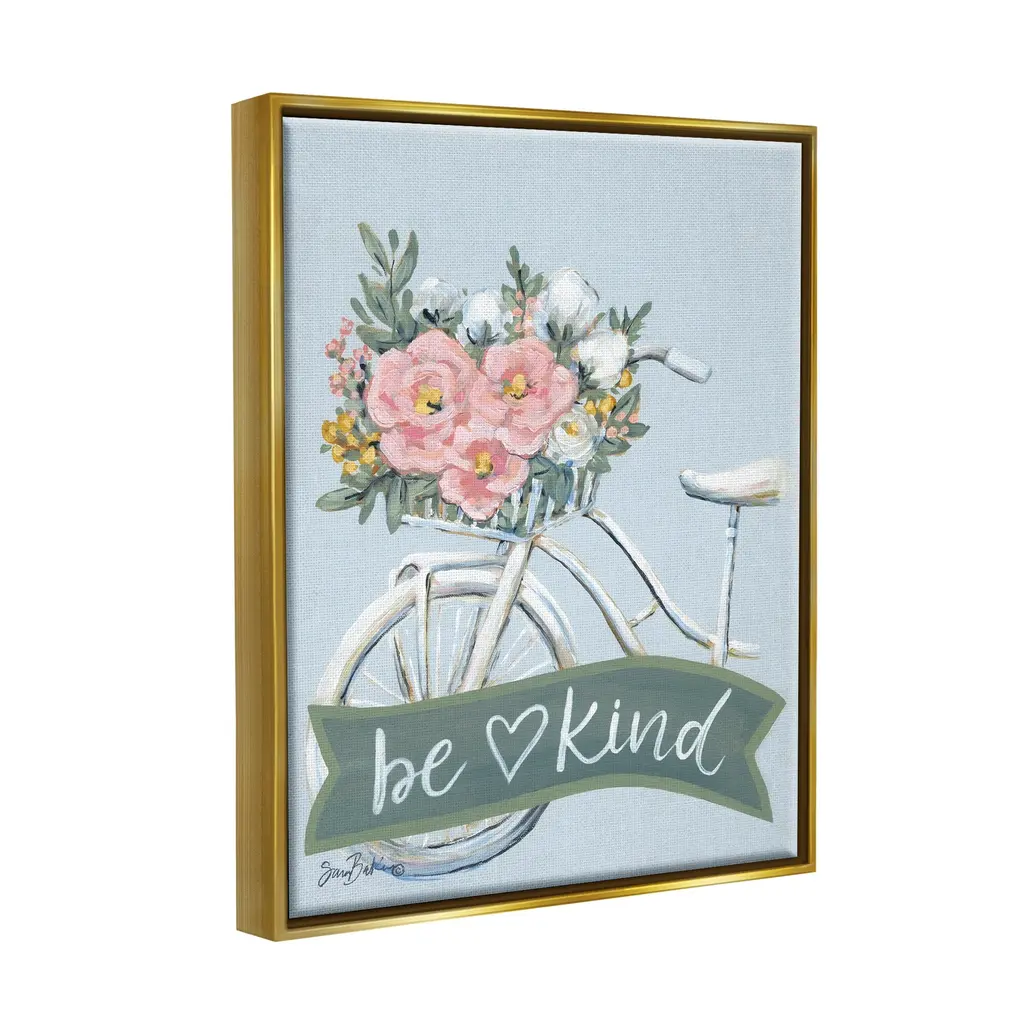 Elevate your home or office to the next level with Stupell Framed Floating Canvas Wall Art. Our premium hand-stretched canvas is mounted securely into a sturdy lightweight frame. The museum-style gap between the wrapped canvas and the box frame gives the illusion of floating artwork. Stupell Wall Art is made in the USA.Features: Dimensions: 17 x 1.7 x 21 Frame, 16 x 1.5 x 20 Canvas ArtFloating Frame Sizes Include Standard: 17 x 1.7 x 21 Oversized: 25 x 1.7 x 31Wall Art is Ready to Hang with Hardware Free Hanging. No installation required. For Easy Set Up Lean or Layer Artwork on Shelf or Against Wall.Our elevated 1.7" Thick Floating Frame is the perfect complement to our canvas style Wall Art. We use only the highest quality inks in house with industry leading printing solutions. Canvas is hand stretched over a durable wood foundation and then mounted securly into a Modern Box Frame. Made in the USA.Artwork Relates To: Floral, Pattern, Flower, Flower Arrangement, Plant, Flower Bouquet, Rose, Transportation, Bicycle, Petal, Be KindDesign by Sara Baker