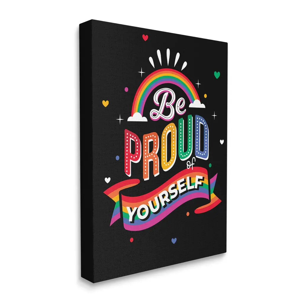 We create our stretched canvas to the highest standards. Using only the highest quality inks and canvas on Mimaki printers, we hand-cut and stretch each piece over a 1.5-inch thick wooden frame for hanging. As a result, the art comes ready to hang on the sturdy ledge with no installation required. Stupell Wall Art is made in the USA.Features: Dimensions: 16 x 1.5 x 20 InchesStretched Canvas Sizes Include Standard: 16 x 1.5 x 20 Large: 20 x 1.5 x 30 X-Large: 30 x 1.5 x 40 Oversized: 36 x 1.5 x 48Wall Art is Ready to Hang - No Installation or Hardware Needed. For Easy Set Up Lean or Layer Artwork on Shelf or Against Wall.Our stretched canvas is created with the highest standards. We use only the highest quality inks and canvas on our in house Mimaki printers, and then hand cut and stretch each piece over a 1.5 inch thick wooden frame for hanging. Made In USA.Artwork Relates To: Rainbow, Pride, LGBTQ, Be Proud Of YourselfDesign by Angela Nickeas