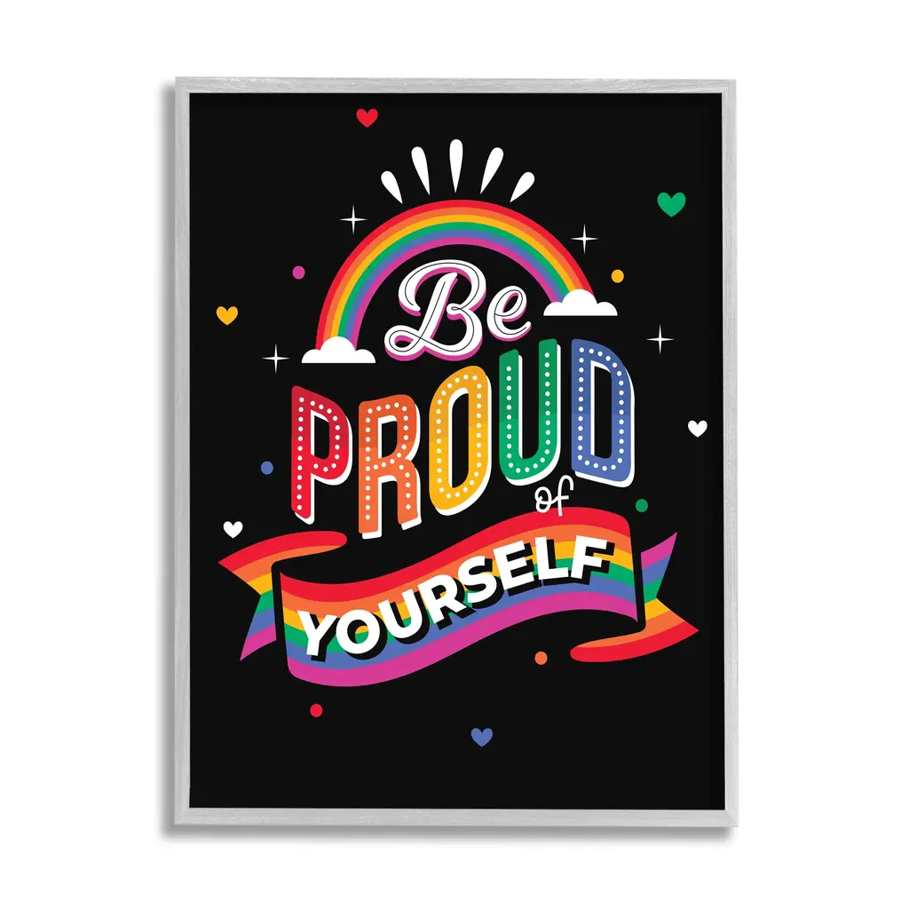 Add dimension to any room with our textured Framed Giclee Artwork. Our framed artwork is securely mounted into a 1.5-inch thick wood grain frame and ready to hang. Frames are available in three alluring styles: black, gray farmhouse and white. In addition, you should check out our oversized options if you want a statement piece. Stupell Wall Art is made in the USA.Features: Dimensions: 11 x 1.5 x 14 FramedFramed Giclee Sizes Include Standard: 11 x 1.5 x 14 Large: 16 x 1.5 x 20 Oversized: 24 x 1.5 x 30Wall Art is Ready to Hang - No Installation or Hardware Needed. For Easy Set Up Lean or Layer Artwork on Shelf or Against Wall.Our giclée prints are carefully mounted on a durable MDF backing, and then perfectly finished in a 1.5 inch thick woodgrain frame. Mounted frame colors include black, gray farmhouse and white. Made In USA.Artwork Relates To: Rainbow, Pride, LGBTQ, Be Proud Of YourselfDesign by Angela Nickeas