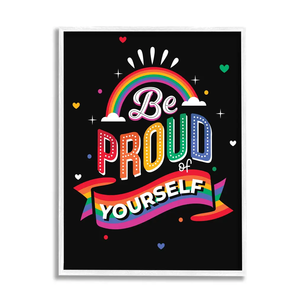Add dimension to any room with our textured Framed Giclee Artwork. Our framed artwork is securely mounted into a 1.5-inch thick wood grain frame and ready to hang. Frames are available in three alluring styles: black, gray farmhouse and white. In addition, you should check out our oversized options if you want a statement piece. Stupell Wall Art is made in the USA.Features: Dimensions: 11 x 1.5 x 14 FramedFramed Giclee Sizes Include Standard: 11 x 1.5 x 14 Large: 16 x 1.5 x 20 Oversized: 24 x 1.5 x 30Wall Art is Ready to Hang - No Installation or Hardware Needed. For Easy Set Up Lean or Layer Artwork on Shelf or Against Wall.Our giclée prints are carefully mounted on a durable MDF backing, and then perfectly finished in a 1.5 inch thick woodgrain frame. Mounted frame colors include black, gray farmhouse and white. Made In USA.Artwork Relates To: Rainbow, Pride, LGBTQ, Be Proud Of YourselfDesign by Angela Nickeas