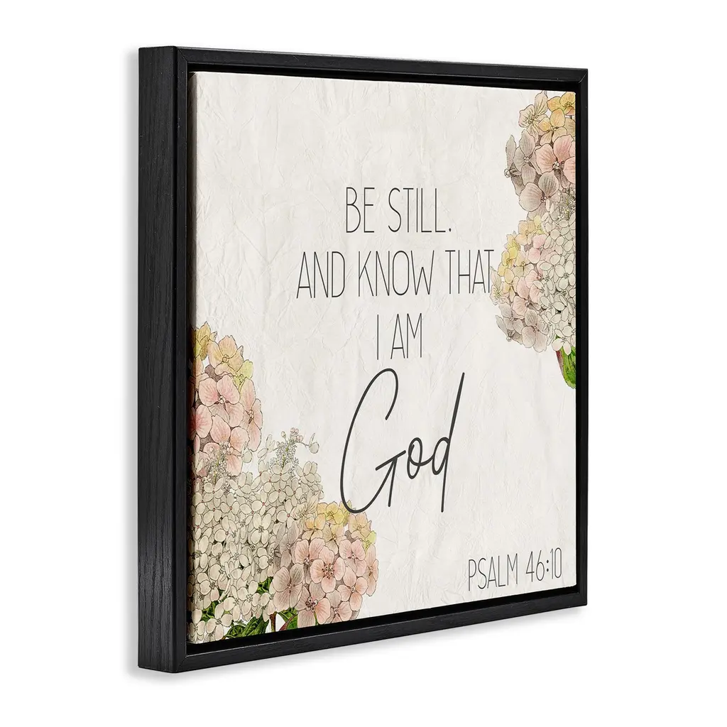 Elevate your home or office to the next level with Stupell Framed Floating Canvas Wall Art. Our premium hand-stretched canvas is mounted securely into a sturdy lightweight frame. The museum-style gap between the wrapped canvas and the box frame gives the illusion of floating artwork. Stupell Wall Art is made in the USA.Features: Dimensions: 18 x 1.7 x 18 Frame, 17 x 1.5 x 17 Canvas ArtFloating Frame Canvas Products are available in sizes 18"x18" and 25"x25". All Floating Frame Canvas Products have a 1.7" Depth.Wall Art is Ready to Hang with Hardware Free Hanging. No Installation required. For Easy Set Up Lean or Layer Artwork on Shelf or Against Wall. Artwork is Permently Fixed into the Frame.Our elevated 1.7" Thick Floating Frame is the perfect complement to our canvas style Wall Art. We use only the highest quality inks in house with industry leading printing solutions. Canvas is hand stretched over a durable wood foundation and then mounted securly into a Modern Box Frame. Made in the USA.Artwork Relates To: Proverb, Floral, Flower, Spiritual, Reigious, Hydrangea, Psalm 46:10Design by Kim Allen