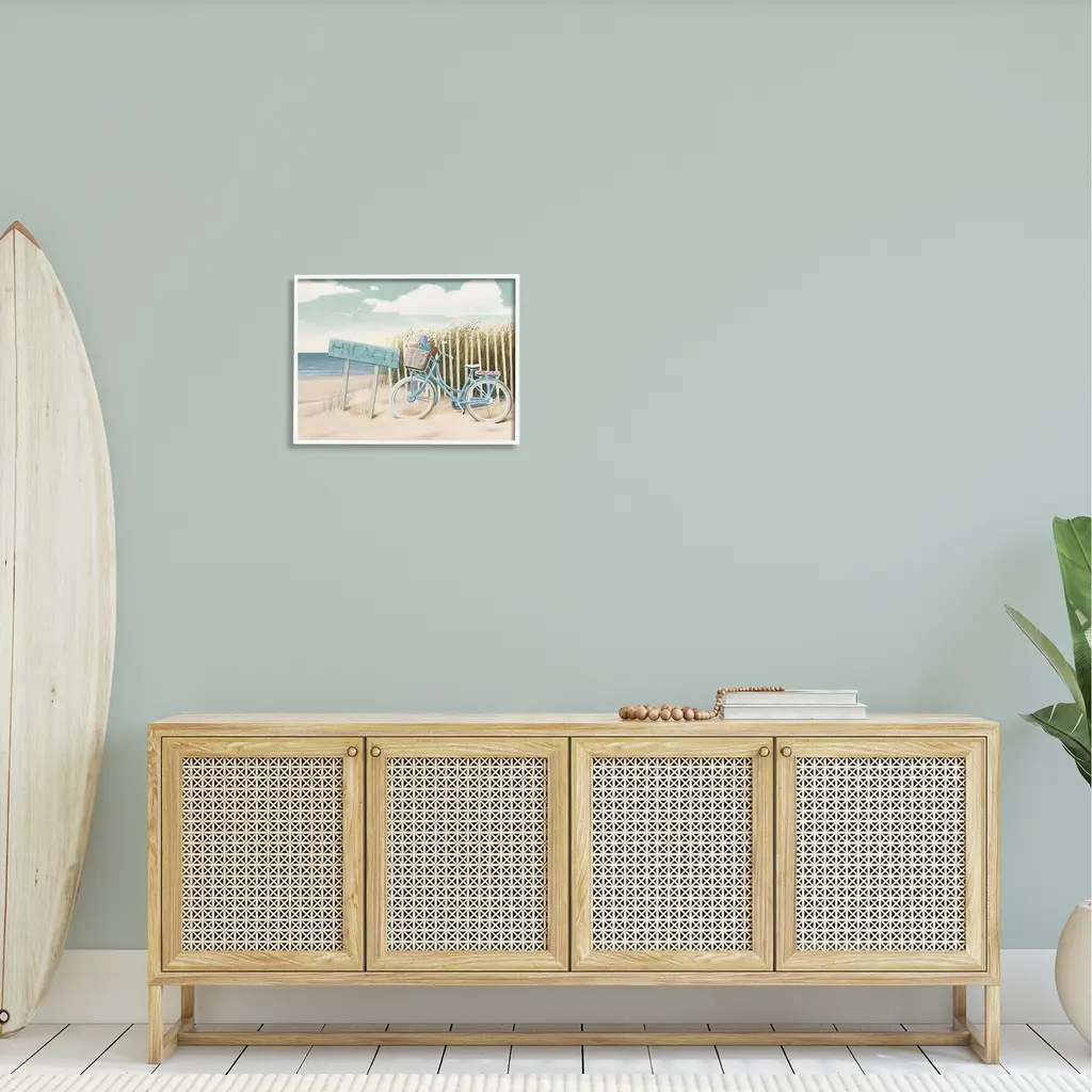 Our Framed Giclee Wall Art adds a touch of class to any space in your home or office. Frames are available in three alluring styles: black, gray farmhouse and white. Our textured artwork will add more depth and dimension to any space. Each piece is mounted with a 1.5 inch thick wood grain frame that is ready to hang! Looking for a statement piece? We have oversized artwork available.Features:Framed Giclee Sizes IncludeStandard: 14 x 1.5 x 11Large: 20 x 1.5 x 16Oversized: 30 x 1.5 x 24Wall Art is Ready to Hang - No Installation or Hardware Needed. For Easy Set Up Lean or Layer Artwork on Shelf or Against Wall.Artwork Relates To: Bicycle, Bike, Vehicle, Transportation, Beach, Ocean, Water, Sand, ShoreOur giclee prints are carefully mounted on a durable MDF backing, and then perfectly finished in a 1.5 inch thick woodgrain frame. Mounted frame colors include black, gray farmhouse and white. Made In USA.Design by James Wiens