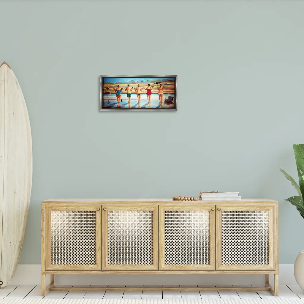 Elevate your home or office to the next level with Stupell Framed Floating Canvas Wall Art. Our premium hand-stretched canvas is mounted securely into a sturdy lightweight frame. The museum-style gap between the wrapped canvas and the box frame gives the illusion of floating artwork. Stupell Wall Art is made in the USA.Features: Dimensions: 25 x 1.7 x 11 Frame, 24 x 1.5 x 10 Canvas ArtFloating Frame Canvas Products are available in sizes 25"x11" and 31"x14". All Floating Frame Canvas Products have a 1.7" Depth.Wall Art is Ready to Hang with Hardware Free Hanging. No Installation required. For Easy Set Up Lean or Layer Artwork on Shelf or Against Wall. Artwork is Permently Fixed into the Frame.Our elevated 1.7" Thick Floating Frame is the perfect complement to our canvas style Wall Art. We use only the highest quality inks in house with industry leading printing solutions. Canvas is hand stretched over a durable wood foundation and then mounted securly into a Modern Box Frame. Made in the USA.Artwork Relates To: Painting, People, Women, Beach, Surfboard, Coast, Reflection, Sky, SummerDesign by Ronald West