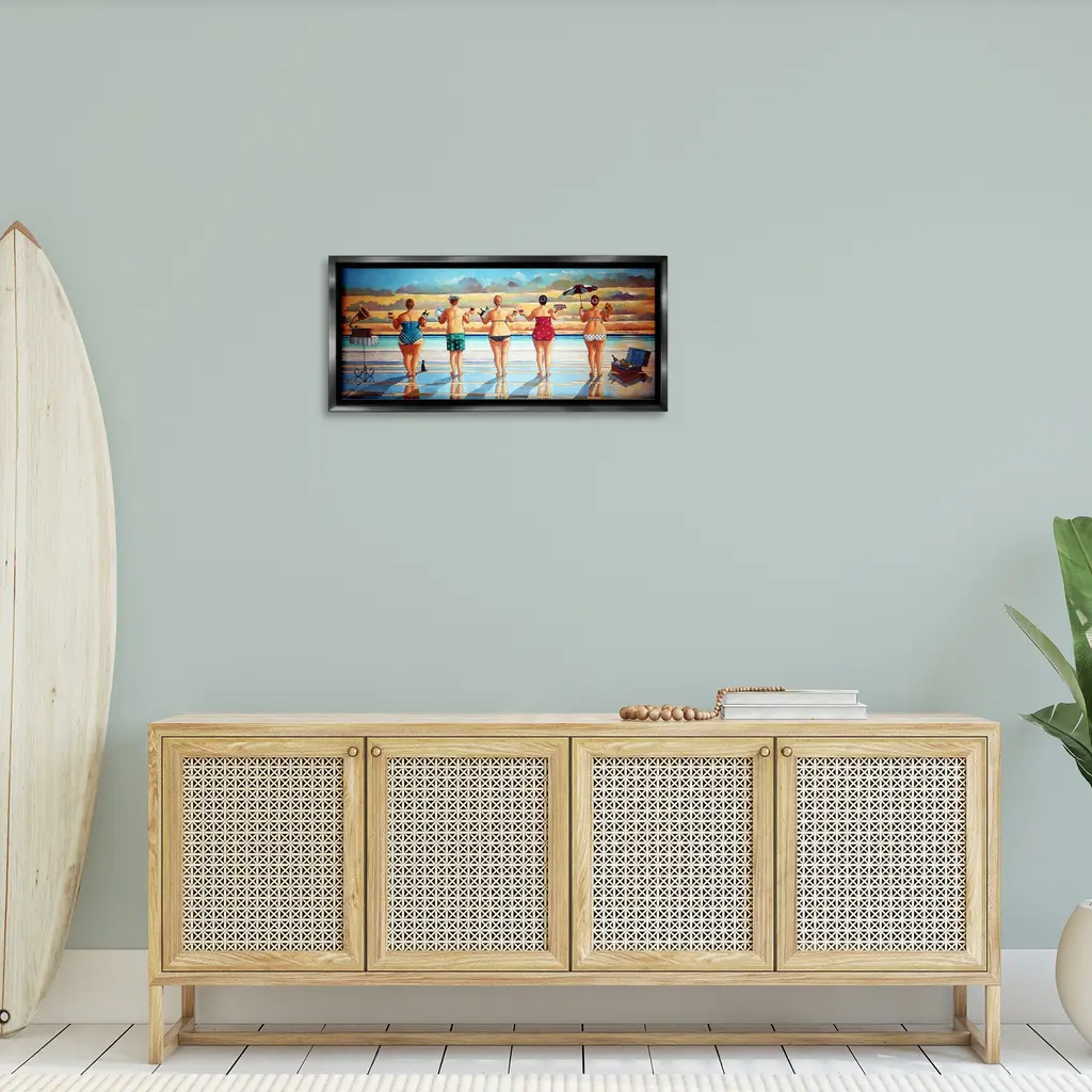 Elevate your home or office to the next level with Stupell Framed Floating Canvas Wall Art. Our premium hand-stretched canvas is mounted securely into a sturdy lightweight frame. The museum-style gap between the wrapped canvas and the box frame gives the illusion of floating artwork. Stupell Wall Art is made in the USA.Features: Dimensions: 25 x 1.7 x 11 Frame, 24 x 1.5 x 10 Canvas ArtFloating Frame Canvas Products are available in sizes 25"x11" and 31"x14". All Floating Frame Canvas Products have a 1.7" Depth.Wall Art is Ready to Hang with Hardware Free Hanging. No Installation required. For Easy Set Up Lean or Layer Artwork on Shelf or Against Wall. Artwork is Permently Fixed into the Frame.Our elevated 1.7" Thick Floating Frame is the perfect complement to our canvas style Wall Art. We use only the highest quality inks in house with industry leading printing solutions. Canvas is hand stretched over a durable wood foundation and then mounted securly into a Modern Box Frame. Made in the USA.Artwork Relates To: Painting, People, Women, Beach, Surfboard, Coast, Reflection, Sky, SummerDesign by Ronald West