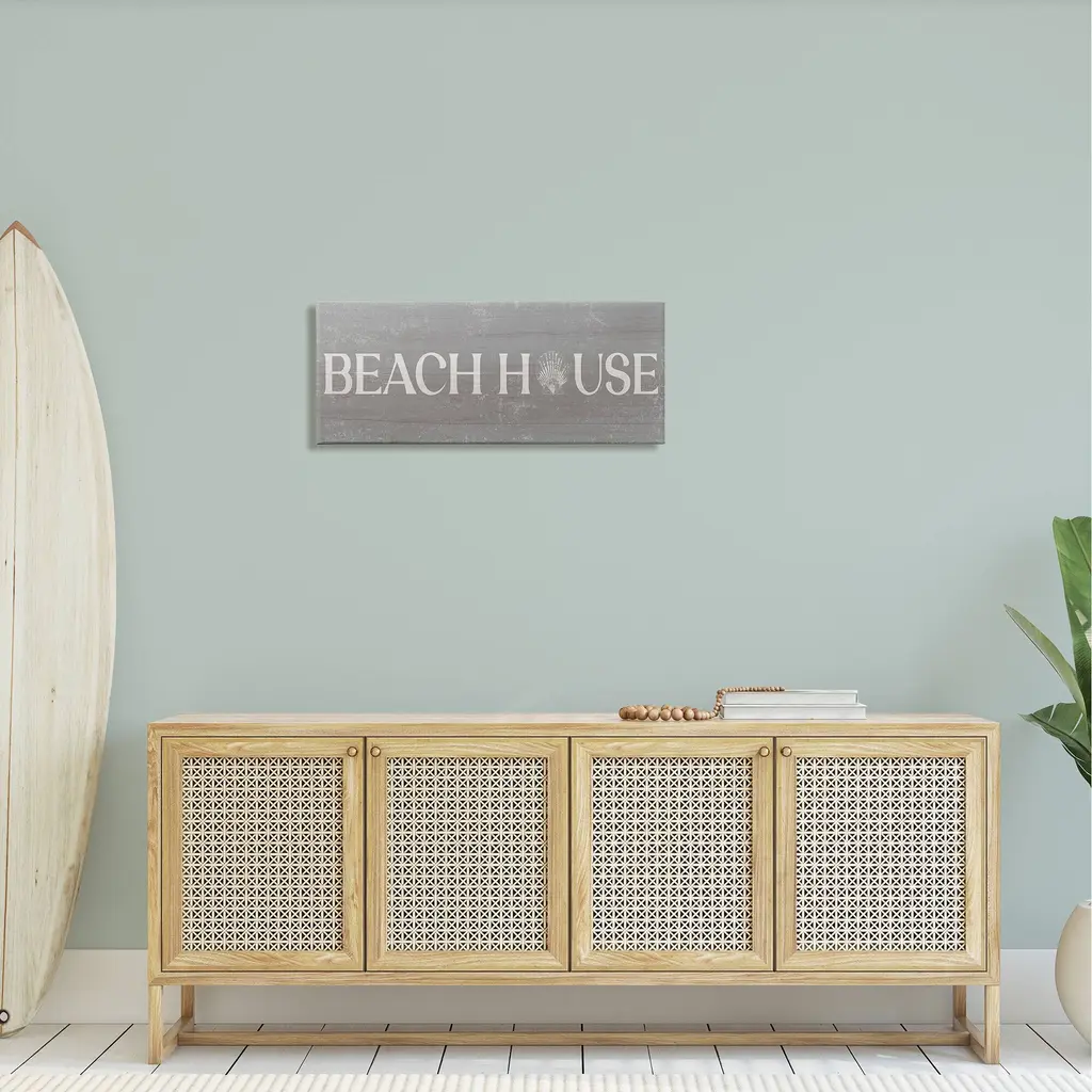 Stupell Beach House Vintage Sign Rustic Shell Design Canvas Wall Art - Grey - 30 X 13