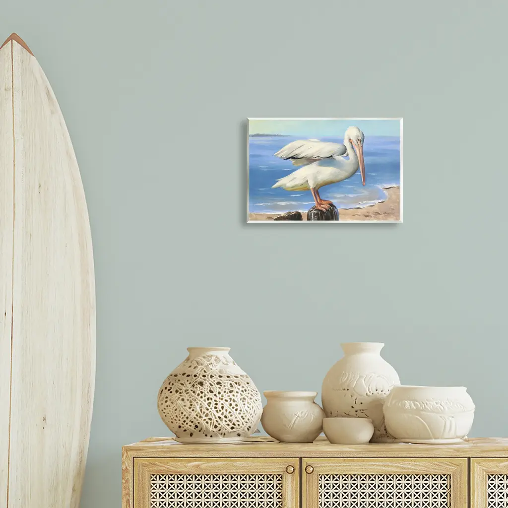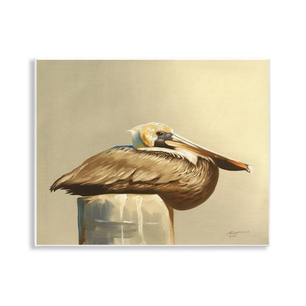 Our wall plaques start as high-quality lithograph prints mounted on durable 0.5-inch thick MDF wood. Each piece is hand finished and comes with a fresh layer of white foil on the sides to give it a crisp, clean look. Plaques arrive ready to hang without installation and come with removable plastic corners to keep them from damage in transit. Stupell Wall Art is made in the USA.Features: Dimensions: 15 x 0.5 x 10 InchesWall Plaque Product Sizes Include 15"x10" and 19"x13". All wall plaque products have a 0.5" Depth. Wall Art is Ready to Hang with Hardware Free Hanging. No installation required. For Easy Set Up Lean or Layer Artwork on Shelf or Against Wall.All of our wall plaques start off as high quality lithograph prints that are then mounted on durable 0.5 inch thick MDF wood. Each piece is hand finished and comes with a fresh layer of foil on the sides to give it a crisp clean look. Made In USA.Artwork Relates To: Animal, Bird, Waterfowl, Beak, Pelican, Water, Lake, BeachDesign by D. Rust