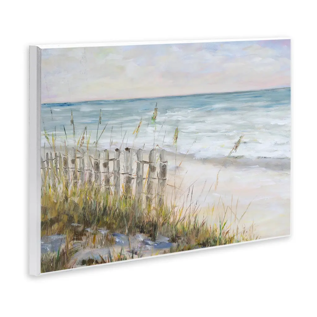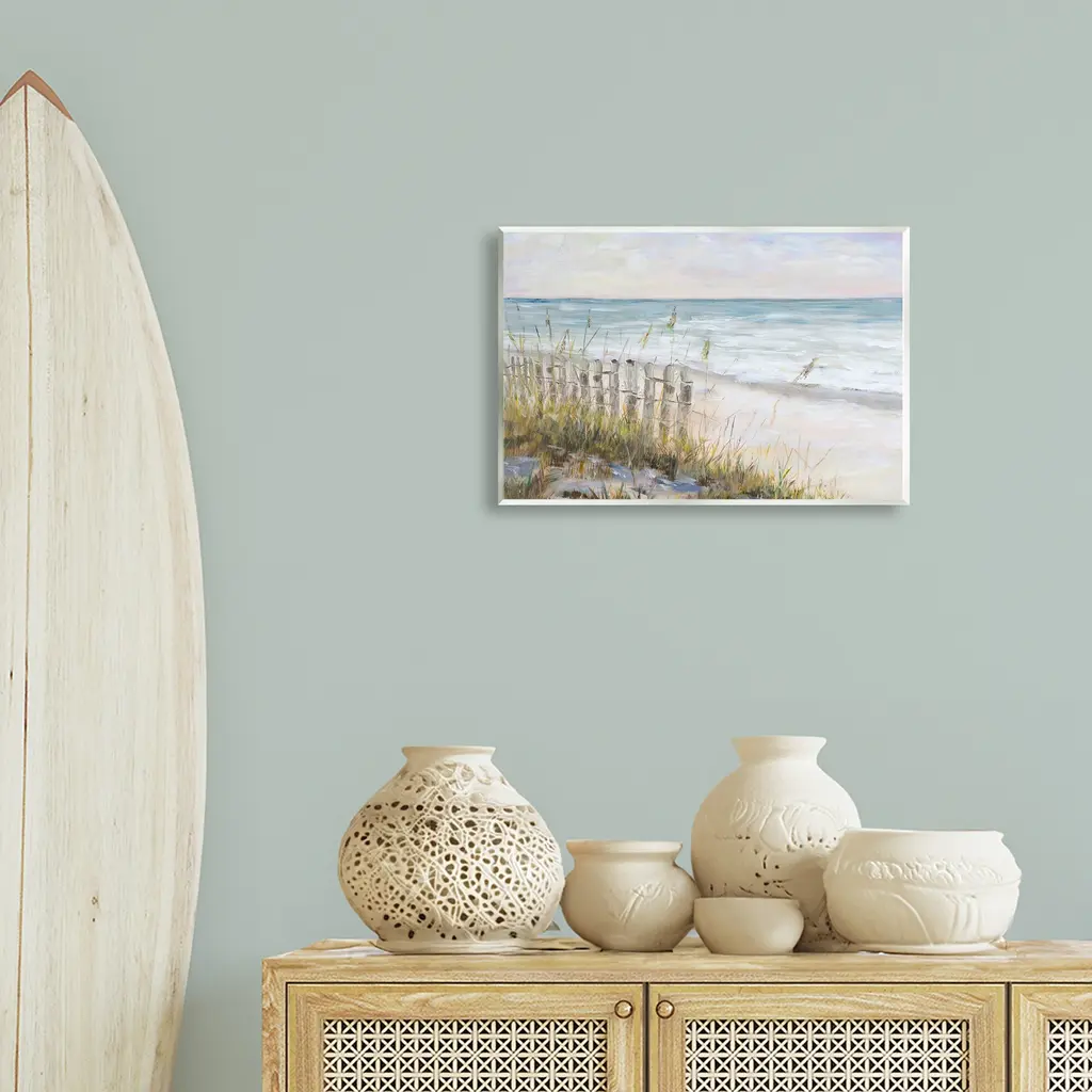 Our wall plaques start as high-quality lithograph prints mounted on durable 0.5-inch thick MDF wood. Each piece is hand finished and comes with a fresh layer of white foil on the sides to give it a crisp, clean look. Plaques arrive ready to hang without installation and come with removable plastic corners to keep them from damage in transit. Stupell Wall Art is made in the USA.Features: Dimensions: 15 x 0.5 x 10 InchesWall Plaque Product Sizes Include 15"x10" and 19"x13". All wall plaque products have a 0.5" Depth. Wall Art is Ready to Hang with Hardware Free Hanging. No installation required. For Easy Set Up Lean or Layer Artwork on Shelf or Against Wall.All of our wall plaques start off as high quality lithograph prints that are then mounted on durable 0.5 inch thick MDF wood. Each piece is hand finished and comes with a fresh layer of foil on the sides to give it a crisp clean look. Made In USA.Artwork Relates To: Painting, Beach, Coast, Nature, Sea, Shoreline, Water, Grass, Plant, Fence, ReedDesign by Julie DeRice