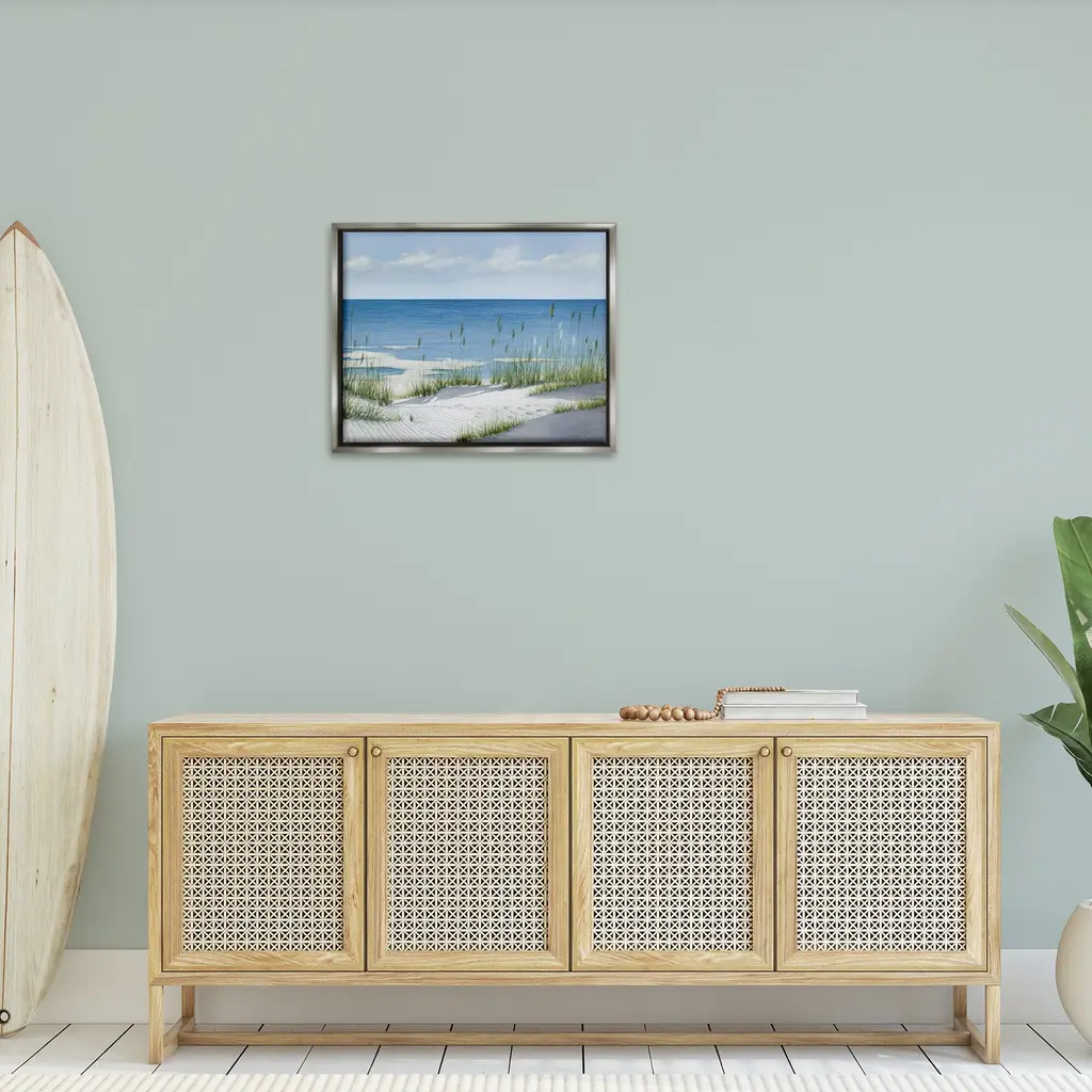 Elevate your home or office to the next level with Stupell Framed Floating Canvas Wall Art. Our premium hand-stretched canvas is mounted securely into a sturdy lightweight frame. The museum-style gap between the wrapped canvas and the box frame gives the illusion of floating artwork. Stupell Wall Art is made in the USA.Features: Dimensions: 21 x 1.7 x 17 Frame, 20 x 1.5 x 16 Canvas ArtFloating Frame Canvas Products are available in sizes 21"x17" and 31"x25". All Floating Frame Canvas Products have a 1.7" Depth.Wall Art is Ready to Hang with Hardware Free Hanging. No Installation required. For Easy Set Up Lean or Layer Artwork on Shelf or Against Wall. Artwork is Permently Fixed into the Frame.Our elevated 1.7" Thick Floating Frame is the perfect complement to our canvas style Wall Art. We use only the highest quality inks in house with industry leading printing solutions. Canvas is hand stretched over a durable wood foundation and then mounted securly into a Modern Box Frame. Made in the USA.Artwork Relates To: Beach, Coast, Sea, Shoreline, Nautical, Shore, Reeds, LandscapeDesign by Max Maxx