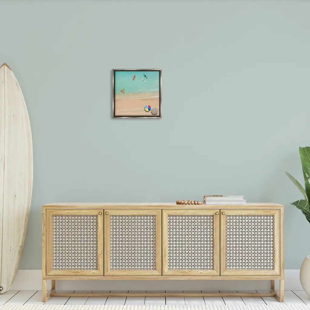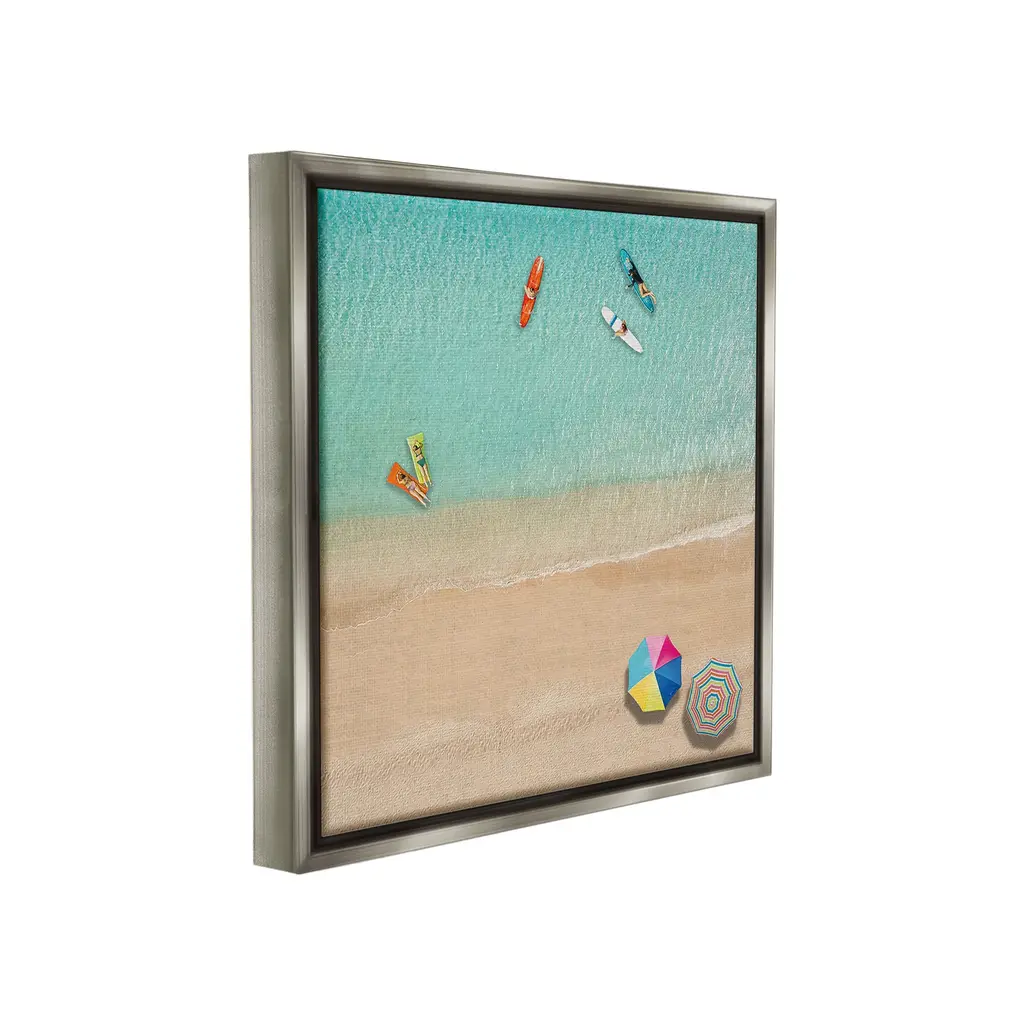 Elevate your home or office to the next level with Stupell Framed Floating Canvas Wall Art. Our premium hand-stretched canvas is mounted securely into a sturdy lightweight frame. The museum-style gap between the wrapped canvas and the box frame gives the illusion of floating artwork. Stupell Wall Art is made in the USA.Features: Dimensions: 18 x 1.7 x 18 Frame, 17 x 1.5 x 17 Canvas ArtFloating Frame Canvas Products are available in sizes 18"x18" and 25"x25". All Floating Frame Canvas Products have a 1.7" Depth.Wall Art is Ready to Hang with Hardware Free Hanging. No Installation required. For Easy Set Up Lean or Layer Artwork on Shelf or Against Wall. Artwork is Permently Fixed into the Frame.Our elevated 1.7" Thick Floating Frame is the perfect complement to our canvas style Wall Art. We use only the highest quality inks in house with industry leading printing solutions. Canvas is hand stretched over a durable wood foundation and then mounted securly into a Modern Box Frame. Made in the USA.Artwork Relates To: Water, Waterfront, Sea, Scenery, Shoreline, Coast, Beach, Canoe, Beach Umbrella, Aerial View, Kayak, SurfboardDesign by Katrina Craven
