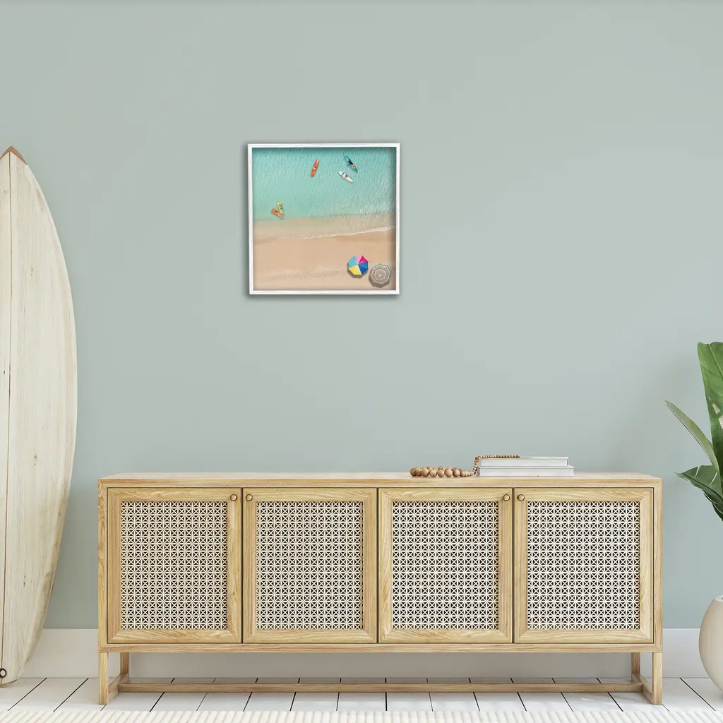 Add dimension to any room with our textured Framed Giclee Artwork. Our framed artwork is securely mounted into a 1.5-inch thick wood grain frame and ready to hang. Frames are available in three alluring styles: black, gray farmhouse and white. In addition, you should check out our oversized options if you want a statement piece. Stupell Wall Art is made in the USA.Features: Dimensions: 12 x 1.5 x 12 FramedFramed Giclee Product Sizes Include 12"x12", 17"x17", and 24"x24". Framed Giclee Products have a 1.5" Depth. Wall Art is Ready to Hang with Hardware Free Hanging. No installation required. For Easy Set Up Lean or Layer Artwork on Shelf or Against Wall.Our giclée prints are carefully mounted on a durable MDF backing, and then perfectly finished in a 1.5 inch thick woodgrain frame. Mounted frame colors include black, gray farmhouse and white. Made In USA.Artwork Relates To: Water, Waterfront, Sea, Scenery, Shoreline, Coast, Beach, Canoe, Beach Umbrella, Aerial View, Kayak, SurfboardDesign by Katrina Craven