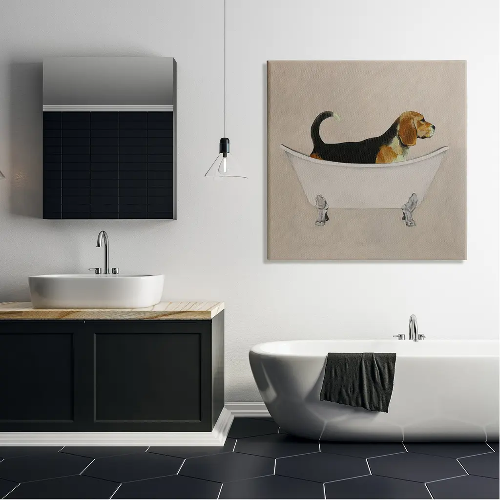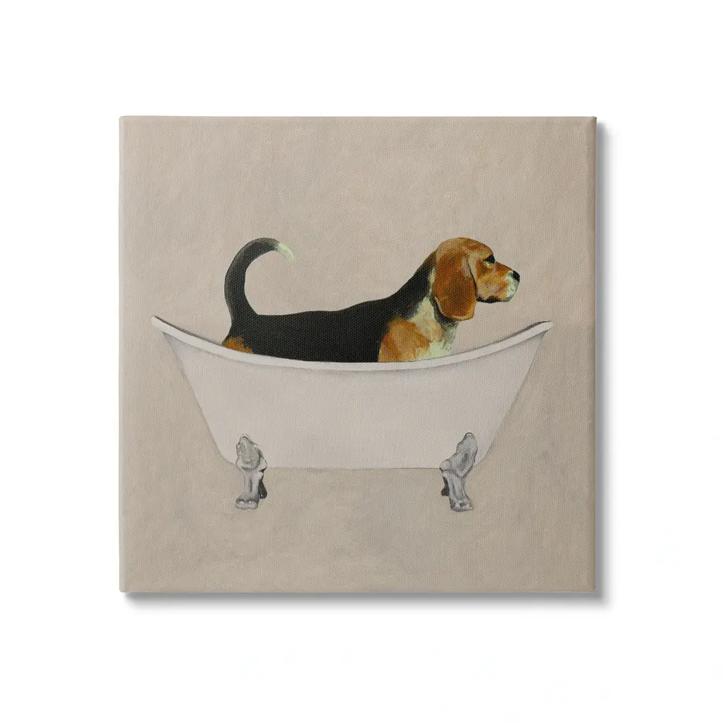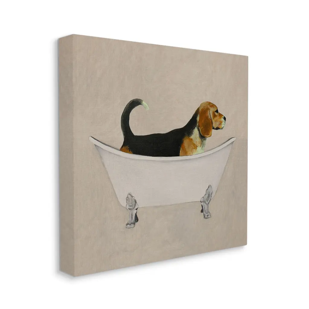 We create our stretched canvas to the highest standards. Using only the highest quality inks and canvas on Mimaki printers, we hand-cut and stretch each piece over a 1.5-inch thick wooden frame for hanging. As a result, the art comes ready to hang on the sturdy ledge with no installation required. Stupell Wall Art is made in the USA.Features: Dimensions: 17 x 1.5 x 17 InchesStretched Canvas Sizes Include Standard: 17 x 1.5 x 17 Large: 24 x 1.5 x 24 X-Large: 30 x 1.5 x 30 Oversized: 36 x 1.5 x 36Wall Art is Ready to Hang - No Installation or Hardware Needed. For Easy Set Up Lean or Layer Artwork on Shelf or Against Wall.Our stretched canvas is created with the highest standards. We use only the highest quality inks and canvas on our in house Mimaki printers, and then hand cut and stretch each piece over a 1.5 inch thick wooden frame for hanging. Made In USA.Artwork Relates To: Animal, Mammal, Wildlife, Bathroom, Dog, BeagleDesign by Coco de Paris