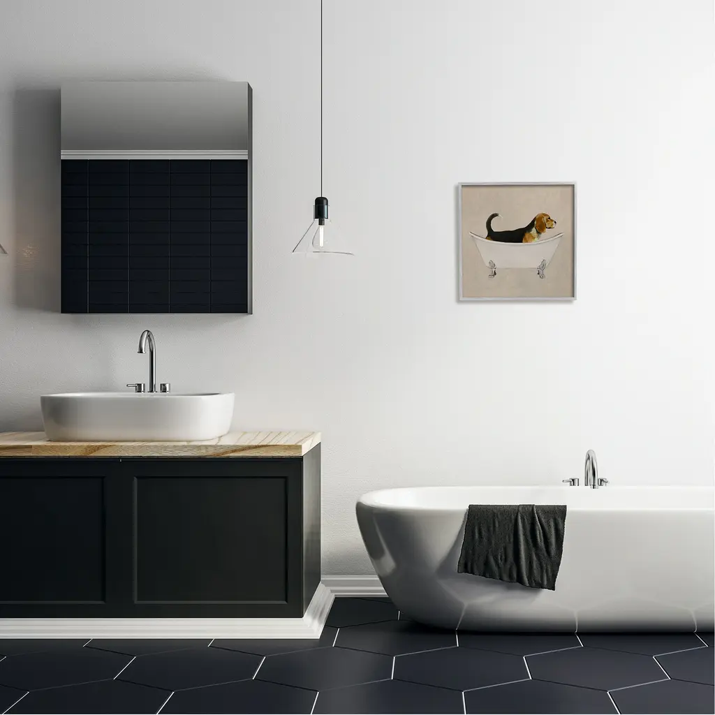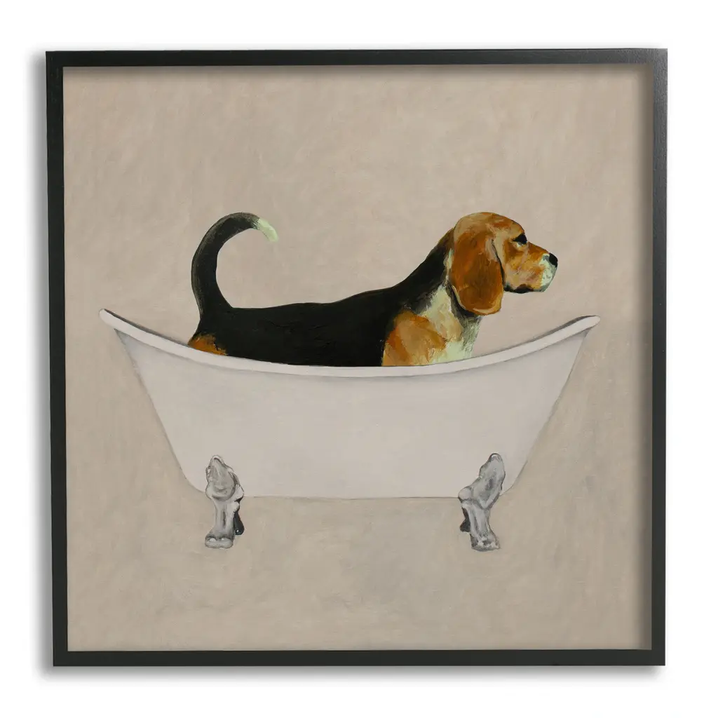 Add dimension to any room with our textured Framed Giclee Artwork. Our framed artwork is securely mounted into a 1.5-inch thick wood grain frame and ready to hang. Frames are available in three alluring styles: black, gray farmhouse and white. In addition, you should check out our oversized options if you want a statement piece. Stupell Wall Art is made in the USA.Features: Dimensions: 12 x 1.5 x 12 FramedFramed Giclee Sizes Include Standard: 12 x 1.5 x 12 Large: 17 x 1.5 x 17 Oversized: 24 x 1.5 x 24Wall Art is Ready to Hang - No Installation or Hardware Needed. For Easy Set Up Lean or Layer Artwork on Shelf or Against Wall.Our giclée prints are carefully mounted on a durable MDF backing, and then perfectly finished in a 1.5 inch thick woodgrain frame. Mounted frame colors include black, gray farmhouse and white. Made In USA.Artwork Relates To: Animal, Mammal, Wildlife, Bathroom, Dog, BeagleDesign by Coco de Paris