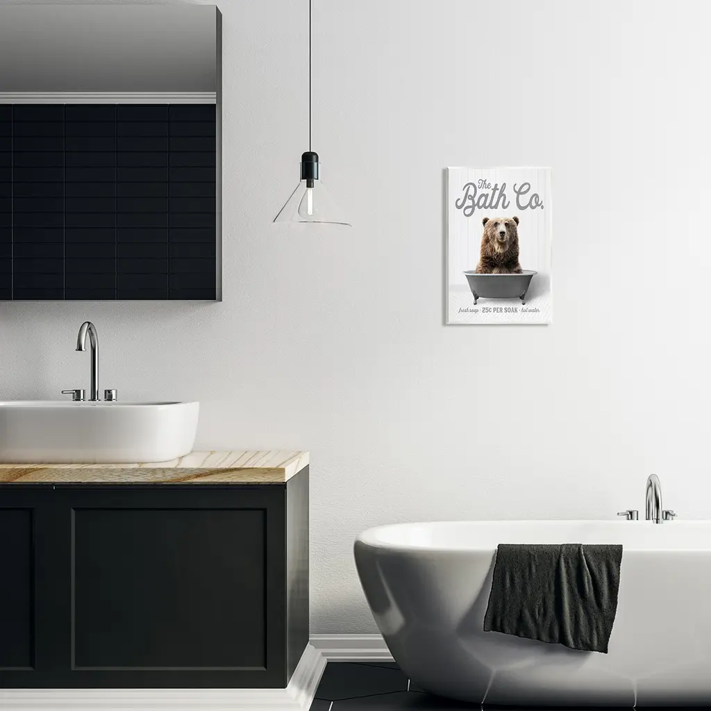 Our wall plaques start as high-quality lithograph prints mounted on durable 0.5-inch thick MDF wood. Each piece is hand finished and comes with a fresh layer of white foil on the sides to give it a crisp, clean look. Plaques arrive ready to hang without installation and come with removable plastic corners to keep them from damage in transit. Stupell Wall Art is made in the USA.Features: Dimensions: 10 x 0.5 x 15 InchesWall Plaque Sizes Include Standard: 10 x 0.5 x 15 Oversized: 13 x 0.5 x 19Wall Art is Ready to Hang with Hardware Free Hanging. No installation required. For Easy Set Up Lean or Layer Artwork on Shelf or Against Wall.All of our wall plaques start off as high quality lithograph prints that are then mounted on durable 0.5 inch thick MDF wood. Each piece is hand finished and comes with a fresh layer of foil on the sides to give it a crisp clean look. Made In USA.Artwork Relates To: Animal, Mammal, Wildlife, Bathroom, Rustic, Bathtub, The Bath Co, BearDesign by Lettered and Lined