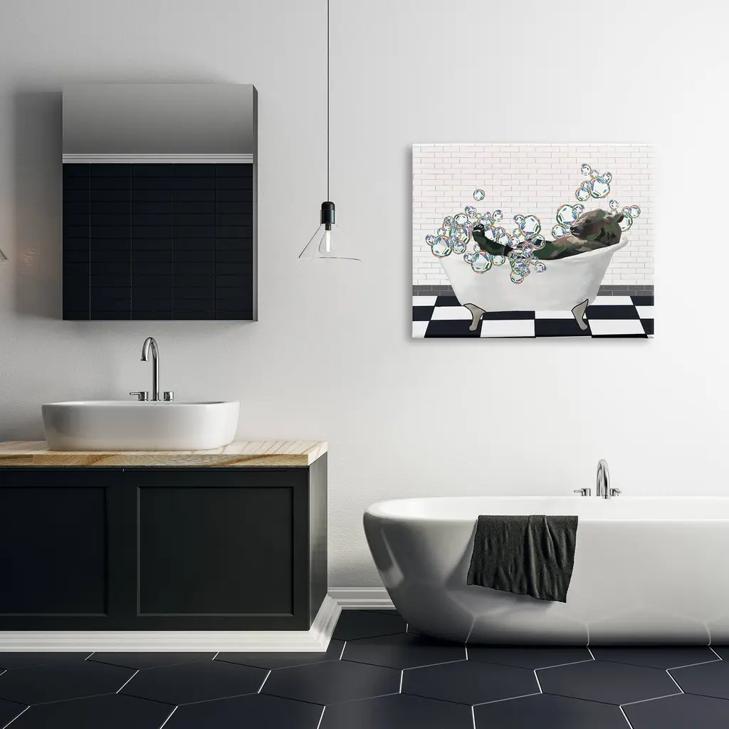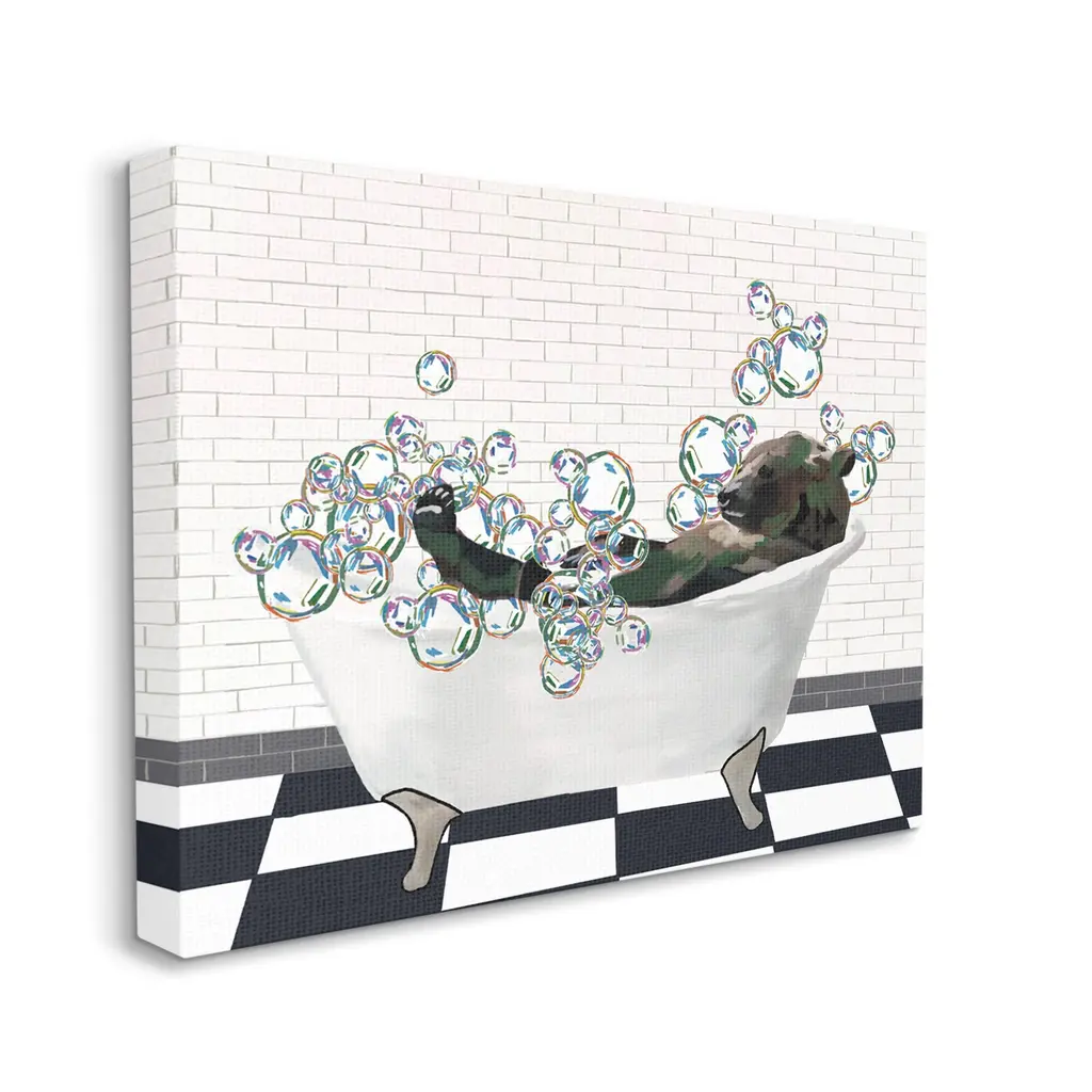 We create our stretched canvas to the highest standards. Using only the highest quality inks and canvas on Mimaki printers, we hand-cut and stretch each piece over a 1.5-inch thick wooden frame for hanging. As a result, the art comes ready to hang on the sturdy ledge with no installation required. Stupell Wall Art is made in the USA.Features: Dimensions: 20 x 1.5 x 16 InchesStretched Canvas Sizes Include Standard: 20 x 1.5 x 16 Large: 30 x 1.5 x 20 X-Large: 40 x 1.5 x 30 Oversized: 48 x 1.5 x 36Wall Art is Ready to Hang with Hardware Free Hanging. No installation required. For Easy Set Up Lean or Layer Artwork on Shelf or Against Wall.Our stretched canvas is created with the highest standards. We use only the highest quality inks and canvas on our in house Mimaki printers, and then hand cut and stretch each piece over a 1.5 inch thick wooden frame for hanging. Made In USA.Artwork Relates To: Bathing, Bathtub, Tub, Pattern, Bathroom, Bubbles, BearDesign by Amelia Noyes