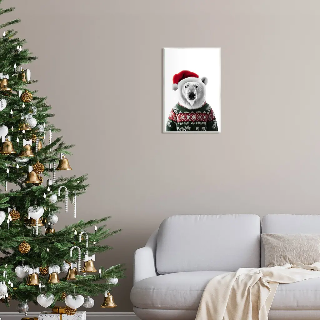 Our wall plaques start as high-quality lithograph prints mounted on durable 0.5-inch thick MDF wood. Each piece is hand finished and comes with a fresh layer of white foil on the sides to give it a crisp, clean look. Plaques arrive ready to hang without installation and come with removable plastic corners to keep them from damage in transit. Stupell Industries Wall Art is made in the USA.Features: Dimensions: 10 x 0.5 x 15 InchesWall Plaque Sizes Include Standard: 10 x 0.5 x 15 Oversized: 13 x 0.5 x 19Wall Art is Ready to Hang with Hardware Free Hanging. No installation required. For Easy Set Up Lean or Layer Artwork on Shelf or Against Wall.All of our wall plaques start off as high quality lithograph prints that are then mounted on durable 0.5 inch thick MDF wood. Each piece is hand finished and comes with a fresh layer of foil on the sides to give it a crisp clean look. Made In USA.Artwork Relates To: Glasses, Animal, Holiday, Christmas, Santa Hat, Mammal, Wildlife, Polar BearDesign by Annalisa Latella