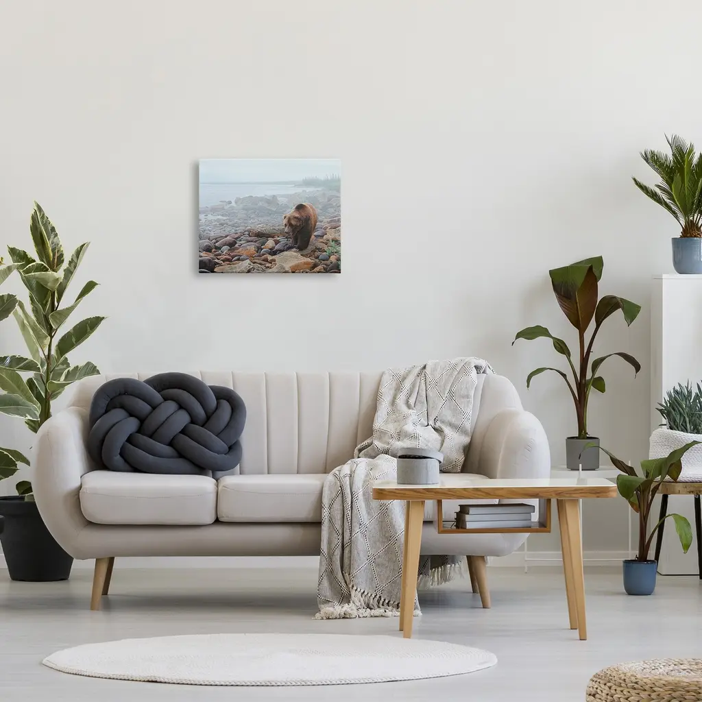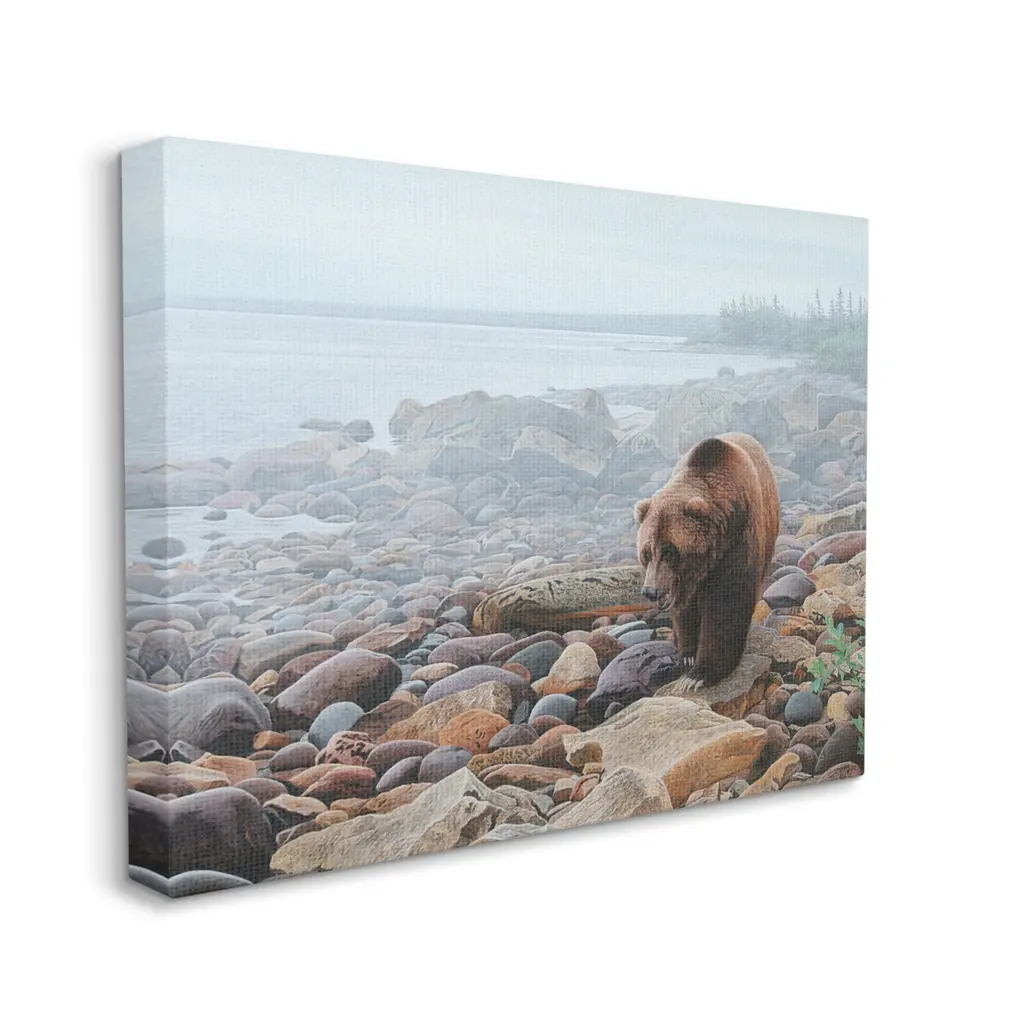 We create our stretched canvas to the highest standards. Using only the highest quality inks and canvas on Mimaki printers, we hand-cut and stretch each piece over a 1.5-inch thick wooden frame for hanging. As a result, the art comes ready to hang on the sturdy ledge with no installation required. Stupell Wall Art is made in the USA.Features: Dimensions: 20 x 1.5 x 16 InchesStretched Canvas Sizes Include Standard: 20 x 1.5 x 16 Large: 30 x 1.5 x 20 X-Large: 40 x 1.5 x 30 Oversized: 48 x 1.5 x 36Wall Art is Ready to Hang with Hardware Free Hanging. No installation required. For Easy Set Up Lean or Layer Artwork on Shelf or Against Wall.Our stretched canvas is created with the highest standards. We use only the highest quality inks and canvas on our in house Mimaki printers, and then hand cut and stretch each piece over a 1.5 inch thick wooden frame for hanging. Made In USA.Artwork Relates To: Animal, Bear, Mammal, Wildlife, Rock, Pebble, Bird, Brown Bear, Water, Nature, SeaDesign by Clinton Jammer