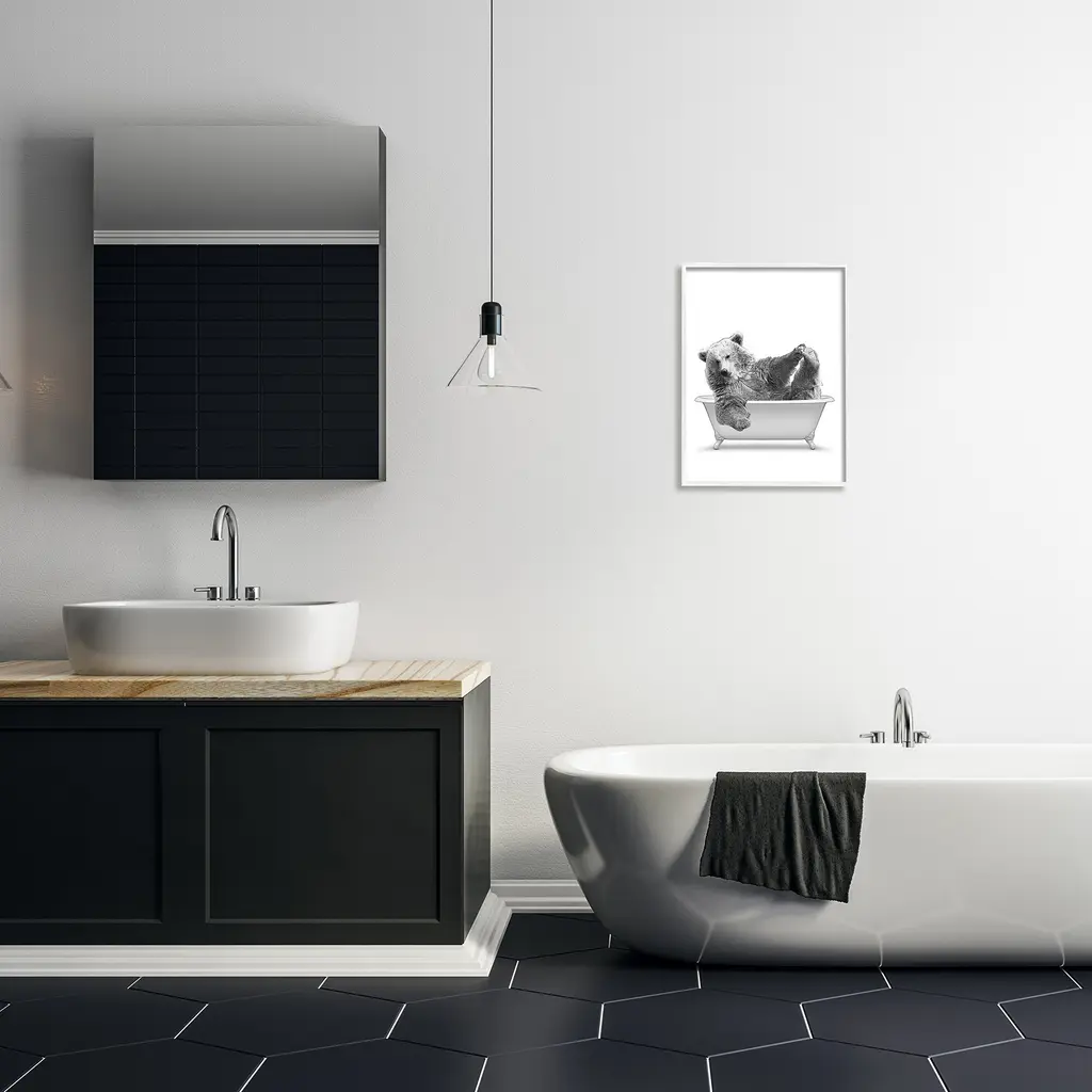 Add dimension to any room with our textured Framed Giclee Artwork. Our framed artwork is securely mounted into a 1.5-inch thick wood grain frame and ready to hang. Frames are available in three alluring styles: black, gray farmhouse and white. In addition, you should check out our oversized options if you want a statement piece. Stupell Wall Art is made in the USA.Features: Dimensions: 11 x 1.5 x 14 FramedFramed Giclee Sizes Include Standard: 11 x 1.5 x 14 Large: 16 x 1.5 x 20 Oversized: 24 x 1.5 x 30Wall Art is Ready to Hang - No Installation or Hardware Needed. For Easy Set Up Lean or Layer Artwork on Shelf or Against Wall.Our giclée prints are carefully mounted on a durable MDF backing, and then perfectly finished in a 1.5 inch thick woodgrain frame. Mounted frame colors include black, gray farmhouse and white. Made In USA.Artwork Relates To: Animal, Mammal, Wildlife, Bathroom, BearDesign by Annalisa Latella