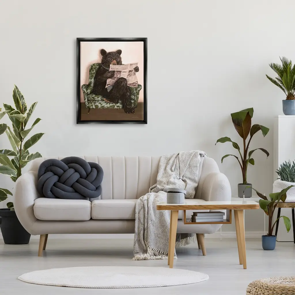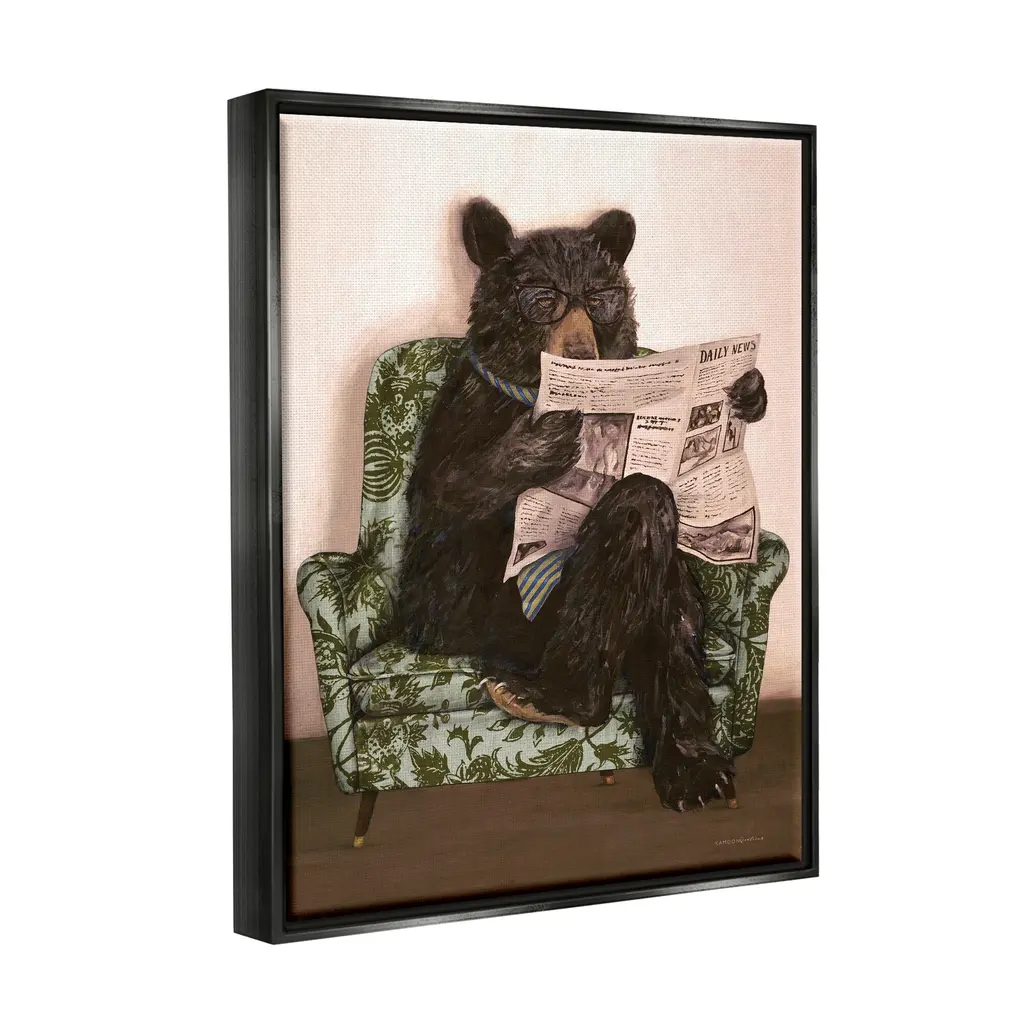 Elevate your home or office to the next level with Stupell Framed Floating Canvas Wall Art. Our premium hand-stretched canvas is mounted securely into a sturdy lightweight frame. The museum-style gap between the wrapped canvas and the box frame gives the illusion of floating artwork. Stupell Wall Art is made in the USA.Features: Dimensions: 17 x 1.7 x 21 Frame, 16 x 1.5 x 20 Canvas ArtFloating Frame Sizes Include Standard: 17 x 1.7 x 21 Oversized: 25 x 1.7 x 31Wall Art is Ready to Hang with Hardware Free Hanging. No installation required. For Easy Set Up Lean or Layer Artwork on Shelf or Against Wall.Our elevated 1.7" Thick Floating Frame is the perfect complement to our canvas style Wall Art. We use only the highest quality inks in house with industry leading printing solutions. Canvas is hand stretched over a durable wood foundation and then mounted securly into a Modern Box Frame. Made in the USA.Artwork Relates To: Couch, Animal, Bear, Mammal, Wildlife, NewspaperDesign by Kamdon Kreations