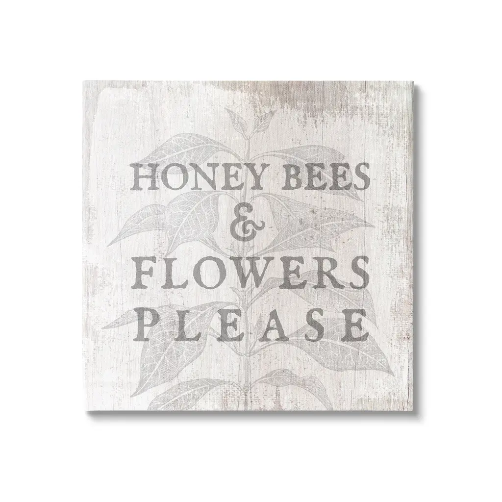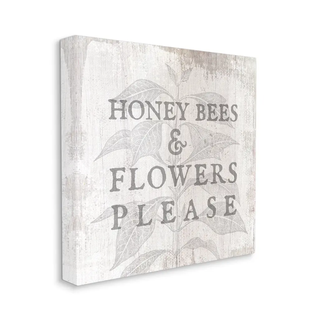 We create our stretched canvas to the highest standards. Using only the highest quality inks and canvas on Mimaki printers, we hand-cut and stretch each piece over a 1.5-inch thick wooden frame for hanging. As a result, the art comes ready to hang on the sturdy ledge with no installation required. Stupell Wall Art is made in the USA.Features: Dimensions: 17 x 1.5 x 17 InchesStretched Canvas Sizes Include Standard: 17 x 1.5 x 17 Large: 24 x 1.5 x 24 X-Large: 30 x 1.5 x 30 Oversized: 36 x 1.5 x 36Wall Art is Ready to Hang with Hardware Free Hanging. No installation required. For Easy Set Up Lean or Layer Artwork on Shelf or Against Wall.Our stretched canvas is created with the highest standards. We use only the highest quality inks and canvas on our in house Mimaki printers, and then hand cut and stretch each piece over a 1.5 inch thick wooden frame for hanging. Made In USA.Artwork Relates To: Phrase, Floral, Botanical, Country, Honey Bees & Flowers PleaseDesign by Lil' Rue