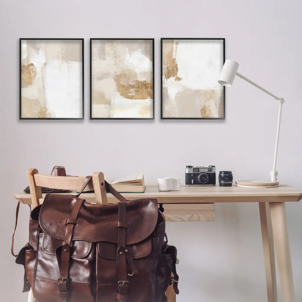 Fill any space in your home or office with our Framed Wall Art Sets. Our framed artwork is securely mounted into a 1.5-inch thick wood grain frame and ready to hang. Frames are available in three alluring styles: black, gray farmhouse and white. Stupell Wall Art is made in the USA.Features: Dimensions: 3 Piece Set, Each Panel is 11 x 1.5 x 14 FramedFramed Giclee Set Sizes Include Standard: 3pc, Each is 11 x 1.5 x 14 Large: 3pc, Each is 16 x 1.5 x 20 Oversized: 3pc, Each is 24 x 1.5 x 30Wall Art is Ready to Hang with Hardware Free Hanging. No installation required. For Easy Set Up Lean or Layer Artwork on Shelf or Against Wall.Curated Wall Art Sets make it easy for you complete the theme for any room. Our giclée prints are carefully mounted on a durable MDF backing, and then perfectly finished in a 1.5 inch thick woodgrain frame. Mounted frame colors include black, gray farmhouse and white. Made In USA.Artwork Relates To: Painting, Abstract, Modern, BeigeDesign by Ros Ruseva