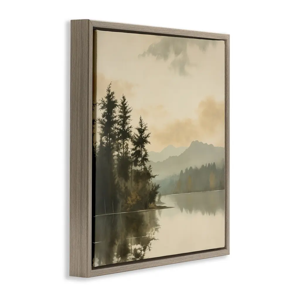 Elevate your home or office to the next level with Stupell Framed Floating Canvas Wall Art. Our premium hand-stretched canvas is mounted securely into a sturdy lightweight frame. The museum-style gap between the wrapped canvas and the box frame gives the illusion of floating artwork. Stupell Wall Art is made in the USA.Features: Dimensions: 18 x 1.7 x 18 Frame, 17 x 1.5 x 17 Canvas ArtFloating Frame Canvas Products are available in sizes 18"x18" and 25"x25". All Floating Frame Canvas Products have a 1.7" Depth.Wall Art is Ready to Hang with Hardware Free Hanging. No Installation required. For Easy Set Up Lean or Layer Artwork on Shelf or Against Wall. Artwork is Permently Fixed into the Frame.Our elevated 1.7" Thick Floating Frame is the perfect complement to our canvas style Wall Art. We use only the highest quality inks in house with industry leading printing solutions. Canvas is hand stretched over a durable wood foundation and then mounted securly into a Modern Box Frame. Made in the USA.Artwork Relates To: Nature, Water, Scenery, Lake, Mist, Landscape, Pine, Woodland, MountainDesign by Irena Orlov