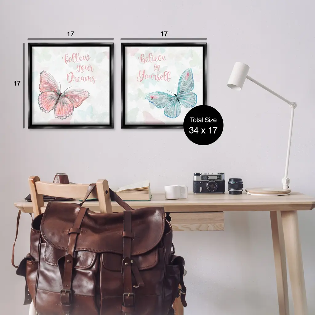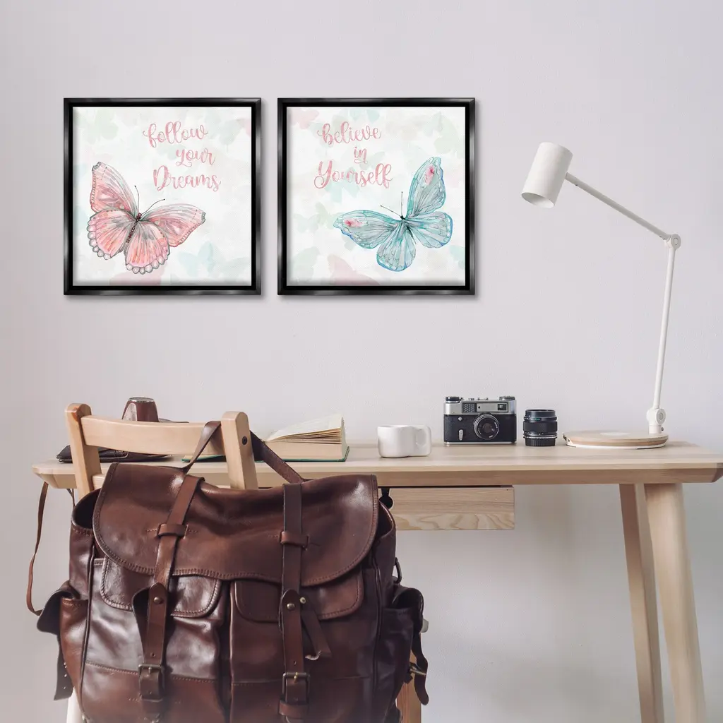 Elevate your home or office to the next level with Stupell Framed Floating Canvas Wall Art. Our premium hand-stretched canvas is mounted securely into a sturdy lightweight frame. The museum-style gap between the wrapped canvas and the box frame gives the illusion of floating artwork. Stupell Wall Art is made in the USA.Features: Dimensions: 2 Piece Set, Each Frame is 18 x 1.7 x 18Two Piece Floating Frame Canvas Products are available as 18"x18" or 25"x25" Panels. All Floating Frame Canvas Products have a 1.7" Depth.Wall Art is Ready to Hang with Hardware Free Hanging. No Installation required. For Easy Set Up Lean or Layer Artwork on Shelf or Against Wall. Artwork is Permently Fixed into the Frame.Our elevated 1.7" Thick Floating Frame is the perfect complement to our canvas style Wall Art. We use only the highest quality inks in house with industry leading printing solutions. Canvas is hand stretched over a durable wood foundation and then mounted securly into a Modern Box Frame. Made in the USA.Artwork Relates To: Butterflies, Inspirational, Insect, Pastel, Patterned, KidsDesign by Carol Robinson