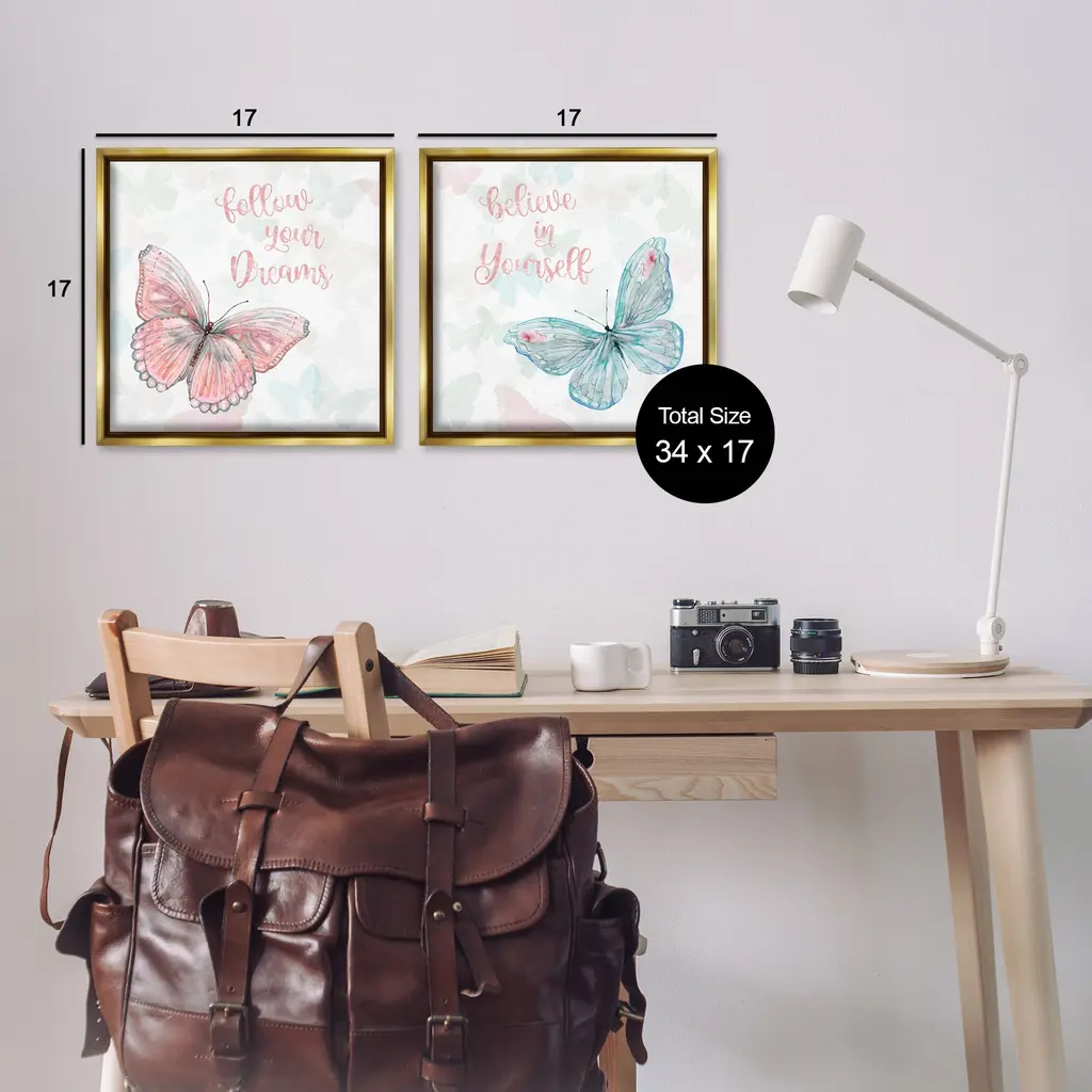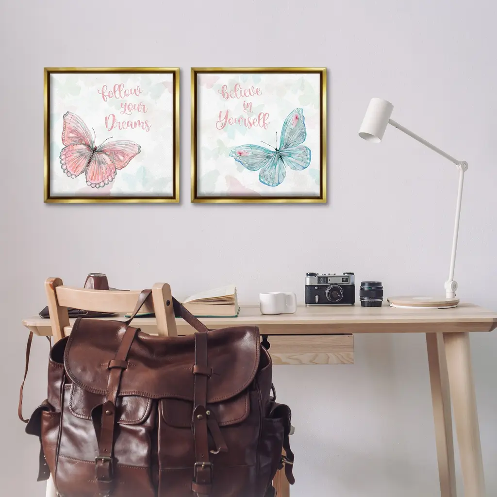 Elevate your home or office to the next level with Stupell Framed Floating Canvas Wall Art. Our premium hand-stretched canvas is mounted securely into a sturdy lightweight frame. The museum-style gap between the wrapped canvas and the box frame gives the illusion of floating artwork. Stupell Wall Art is made in the USA.Features: Dimensions: 2 Piece Set, Each Frame is 18 x 1.7 x 18Two Piece Floating Frame Canvas Products are available as 18"x18" or 25"x25" Panels. All Floating Frame Canvas Products have a 1.7" Depth.Wall Art is Ready to Hang with Hardware Free Hanging. No Installation required. For Easy Set Up Lean or Layer Artwork on Shelf or Against Wall. Artwork is Permently Fixed into the Frame.Our elevated 1.7" Thick Floating Frame is the perfect complement to our canvas style Wall Art. We use only the highest quality inks in house with industry leading printing solutions. Canvas is hand stretched over a durable wood foundation and then mounted securly into a Modern Box Frame. Made in the USA.Artwork Relates To: Butterflies, Inspirational, Insect, Pastel, Patterned, KidsDesign by Carol Robinson