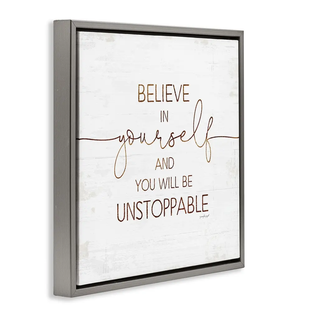 Elevate your home or office to the next level with Stupell Framed Floating Canvas Wall Art. Our premium hand-stretched canvas is mounted securely into a sturdy lightweight frame. The museum-style gap between the wrapped canvas and the box frame gives the illusion of floating artwork. Stupell Wall Art is made in the USA.Features: Dimensions: 18 x 1.7 x 18 Frame, 17 x 1.5 x 17 Canvas ArtFloating Frame Canvas Products are available in sizes 18"x18" and 25"x25". All Floating Frame Canvas Products have a 1.7" Depth.Wall Art is Ready to Hang with Hardware Free Hanging. No Installation required. For Easy Set Up Lean or Layer Artwork on Shelf or Against Wall. Artwork is Permently Fixed into the Frame.Our elevated 1.7" Thick Floating Frame is the perfect complement to our canvas style Wall Art. We use only the highest quality inks in house with industry leading printing solutions. Canvas is hand stretched over a durable wood foundation and then mounted securly into a Modern Box Frame. Made in the USA.Artwork Relates To: Phrase, Motivational, Believe, Unstoppable, Self Esteem, Confidence, InspirationalDesign by Jennifer Pugh