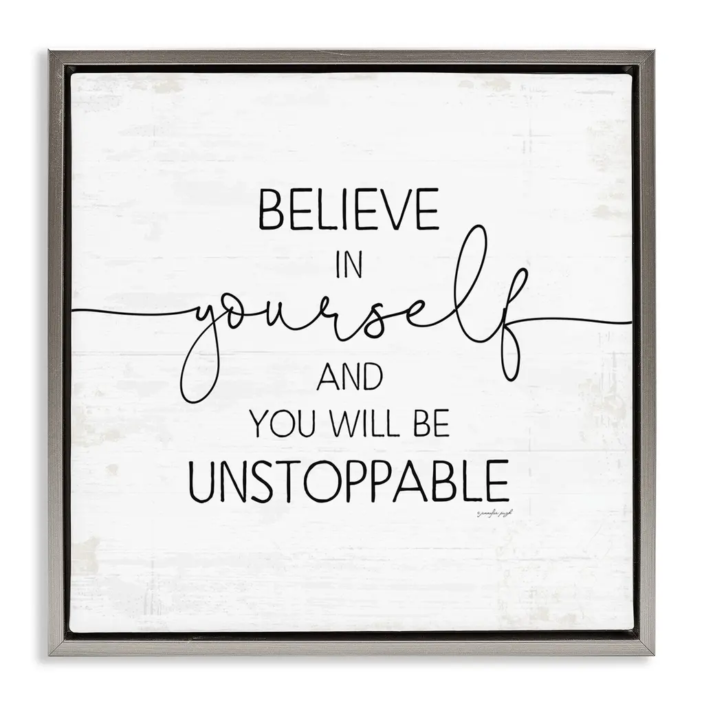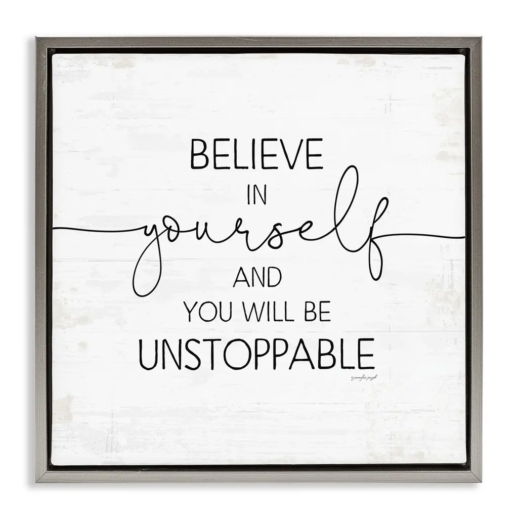 Elevate your home or office to the next level with Stupell Framed Floating Canvas Wall Art. Our premium hand-stretched canvas is mounted securely into a sturdy lightweight frame. The museum-style gap between the wrapped canvas and the box frame gives the illusion of floating artwork. Stupell Wall Art is made in the USA.Features: Dimensions: 18 x 1.7 x 18 Frame, 17 x 1.5 x 17 Canvas ArtFloating Frame Canvas Products are available in sizes 18"x18" and 25"x25". All Floating Frame Canvas Products have a 1.7" Depth.Wall Art is Ready to Hang with Hardware Free Hanging. No Installation required. For Easy Set Up Lean or Layer Artwork on Shelf or Against Wall. Artwork is Permently Fixed into the Frame.Our elevated 1.7" Thick Floating Frame is the perfect complement to our canvas style Wall Art. We use only the highest quality inks in house with industry leading printing solutions. Canvas is hand stretched over a durable wood foundation and then mounted securly into a Modern Box Frame. Made in the USA.Artwork Relates To: Phrase, Motivational, Believe, Unstoppable, Self Esteem, Confidence, InspirationalDesign by Jennifer Pugh