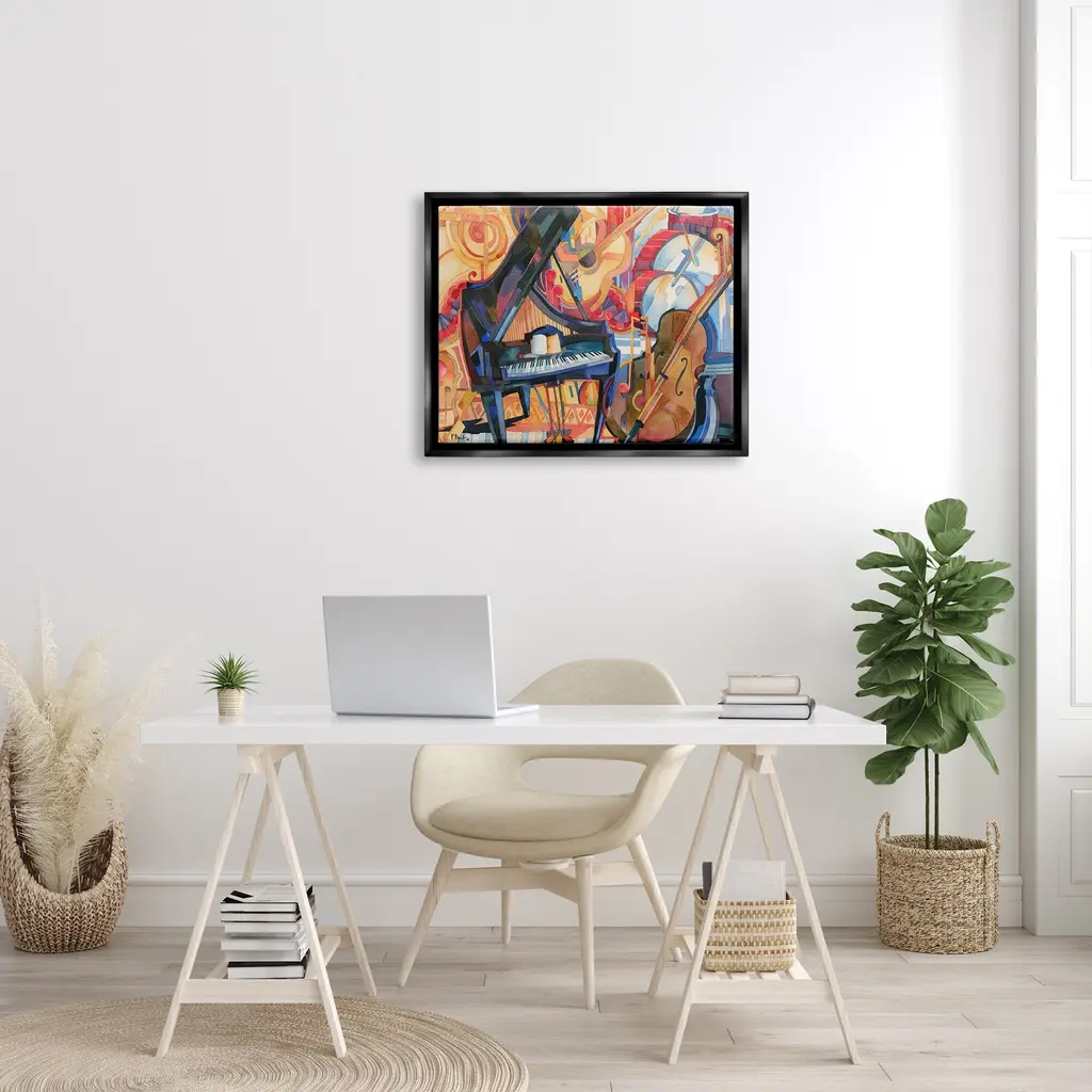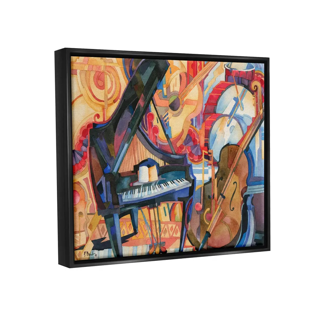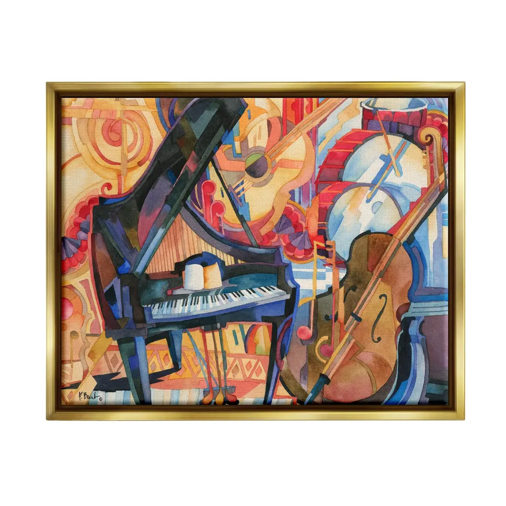 Elevate your home or office to the next level with Stupell Framed Floating Canvas Wall Art. Our premium hand stretched canvas is mounted securly into a sturdy lightweight frame. The museum style gap between wrapped canvas and box frame gives the illusion of floating artwork.Features:Floating Frame Sizes IncludeStandard: 21 x 1.7 x 17Oversized: 31 x 1.7 x 25Wall Art is Ready to Hang - No Installation or Hardware Needed. For Easy Set Up Lean or Layer Artwork on Shelf or Against Wall.Artwork Relates To: Painting, Leisure Activities, Musical Instrument, Modern Art, Cello, Piano, Drums, CollageOur elevated 1.7" Thick Floating Frame is the perfect complement to our canvas style Wall Art. We use only the highest quality inks in house with industry leading printing solutions. Canvas is hand stretched over a durable wood foundation and then mounted securly into a Modern Box Frame. Made in the USA.Design by Paul Brent