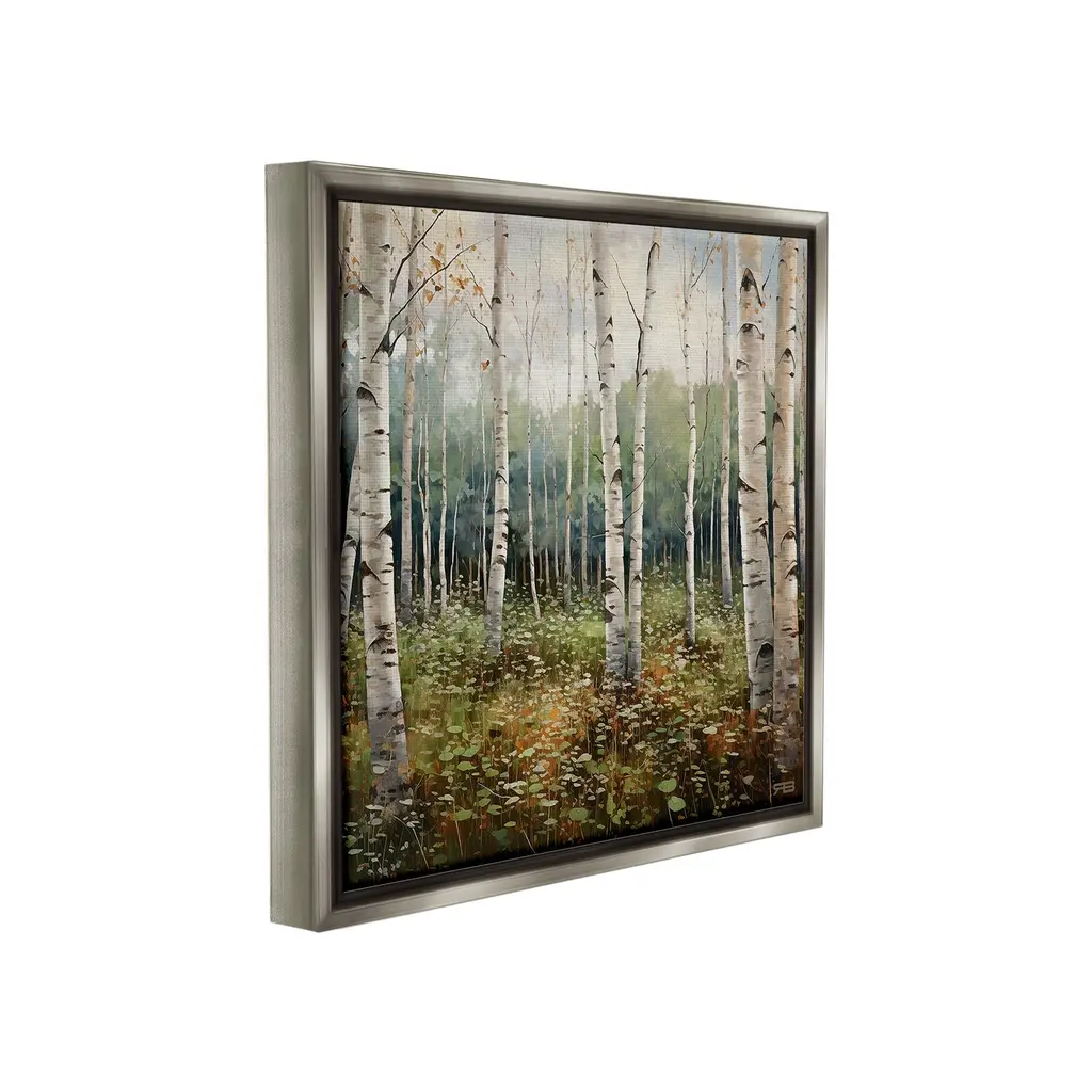 Elevate your home or office to the next level with Stupell Framed Floating Canvas Wall Art. Our premium hand-stretched canvas is mounted securely into a sturdy lightweight frame. The museum-style gap between the wrapped canvas and the box frame gives the illusion of floating artwork. Stupell Wall Art is made in the USA.Features: Dimensions: 18 x 1.7 x 18 Frame, 17 x 1.5 x 17 Canvas ArtFloating Frame Canvas Products are available in sizes 18"x18" and 25"x25". All Floating Frame Canvas Products have a 1.7" Depth.Wall Art is Ready to Hang with Hardware Free Hanging. No Installation required. For Easy Set Up Lean or Layer Artwork on Shelf or Against Wall. Artwork is Permently Fixed into the Frame.Our elevated 1.7" Thick Floating Frame is the perfect complement to our canvas style Wall Art. We use only the highest quality inks in house with industry leading printing solutions. Canvas is hand stretched over a durable wood foundation and then mounted securly into a Modern Box Frame. Made in the USA.Artwork Relates To: Plant, Tree, Vegetation, Grove, Land, Nature, Woodland, Scenery, Birch, Forest, LandscapeDesign by RB