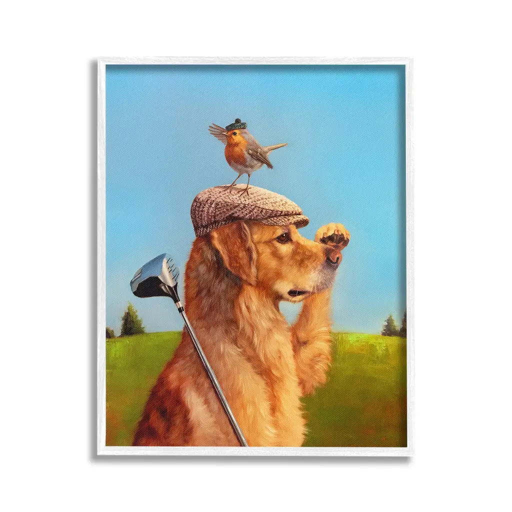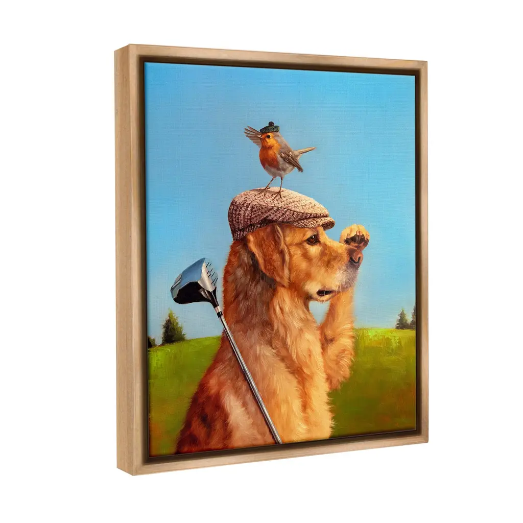 Elevate your home or office to the next level with Stupell Framed Floating Canvas Wall Art. Our premium hand-stretched canvas is mounted securely into a sturdy lightweight frame. The museum-style gap between the wrapped canvas and the box frame gives the illusion of floating artwork. Stupell Wall Art is made in the USA.Features: Dimensions: 17 x 1.7 x 21 Frame, 16 x 1.5 x 20 Canvas ArtFloating Frame Canvas Products are available in sizes 17"x21" and 25"x31". All Floating Frame Canvas Products have a 1.7" Depth.Wall Art is Ready to Hang with Hardware Free Hanging. No Installation required. For Easy Set Up Lean or Layer Artwork on Shelf or Against Wall. Artwork is Permently Fixed into the Frame.Our elevated 1.7" Thick Floating Frame is the perfect complement to our canvas style Wall Art. We use only the highest quality inks in house with industry leading printing solutions. Canvas is hand stretched over a durable wood foundation and then mounted securly into a Modern Box Frame. Made in the USA.Artwork Relates To: Animal, Bird, Canine, Dog, Mammal, Pet, Golden Retriever, Golf, Golfing, Sport, LandscapeDesign by Lucia Heffernan