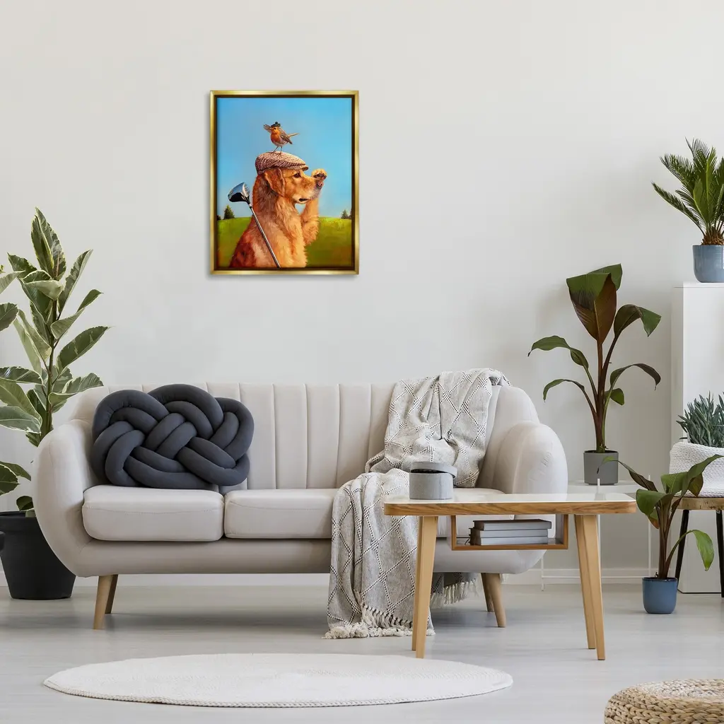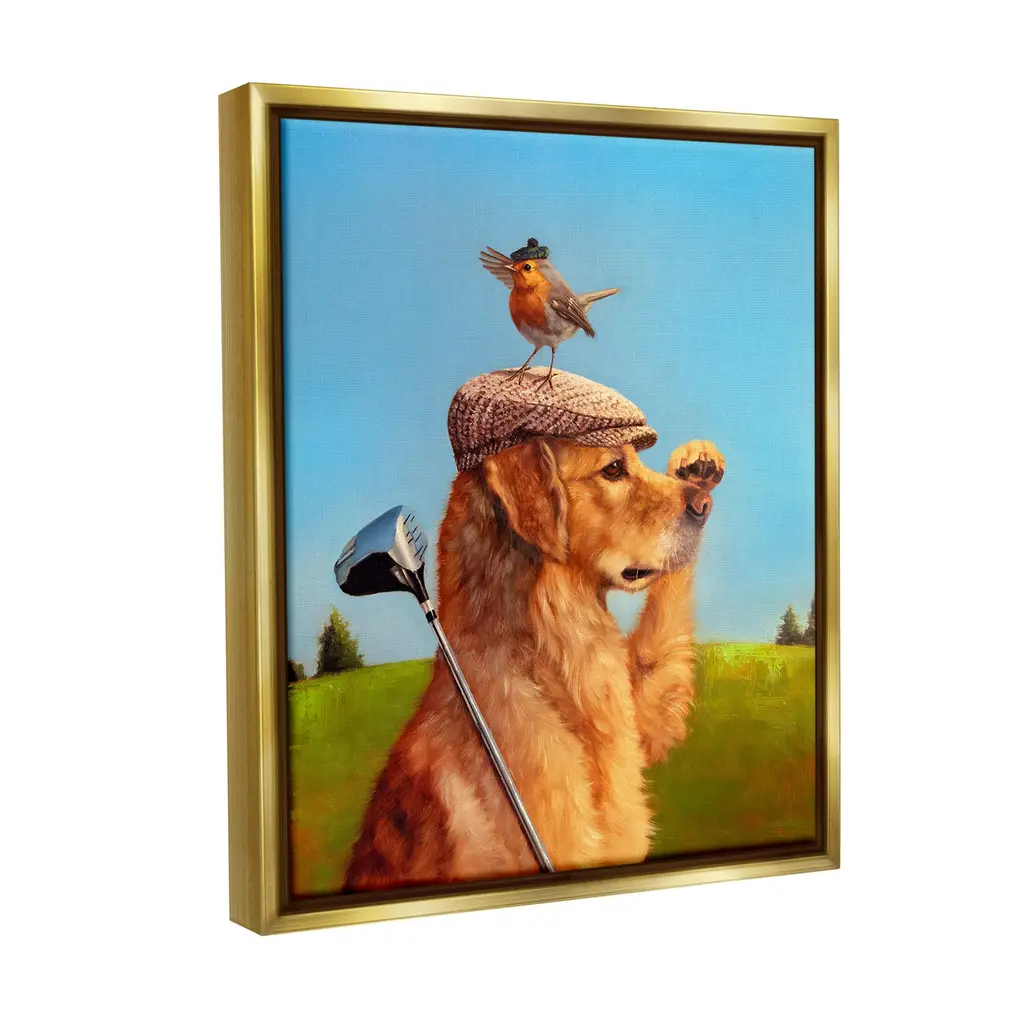 Elevate your home or office to the next level with Stupell Framed Floating Canvas Wall Art. Our premium hand-stretched canvas is mounted securely into a sturdy lightweight frame. The museum-style gap between the wrapped canvas and the box frame gives the illusion of floating artwork. Stupell Wall Art is made in the USA.Features: Dimensions: 17 x 1.7 x 21 Frame, 16 x 1.5 x 20 Canvas ArtFloating Frame Canvas Products are available in sizes 17"x21" and 25"x31". All Floating Frame Canvas Products have a 1.7" Depth.Wall Art is Ready to Hang with Hardware Free Hanging. No Installation required. For Easy Set Up Lean or Layer Artwork on Shelf or Against Wall. Artwork is Permently Fixed into the Frame.Our elevated 1.7" Thick Floating Frame is the perfect complement to our canvas style Wall Art. We use only the highest quality inks in house with industry leading printing solutions. Canvas is hand stretched over a durable wood foundation and then mounted securly into a Modern Box Frame. Made in the USA.Artwork Relates To: Animal, Bird, Canine, Dog, Mammal, Pet, Golden Retriever, Golf, Golfing, Sport, LandscapeDesign by Lucia Heffernan