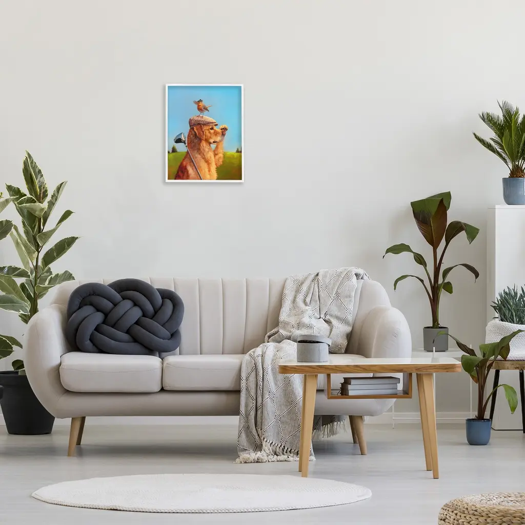 Add dimension to any room with our textured Framed Giclee Artwork. Our framed artwork is securely mounted into a 1.5-inch thick wood grain frame and ready to hang. Frames are available in three alluring styles: black, gray farmhouse and white. In addition, you should check out our oversized options if you want a statement piece. Stupell Wall Art is made in the USA.Features: Dimensions: 11 x 1.5 x 14 FramedFramed Giclee Products are available in the sizes 11"x14", 16"x20" or 24"x30". All Framed Giclee Products have a 1.5" Depth. Wall Art is Ready to Hang with Hardware Free Hanging. No installation required. For Easy Set Up Lean or Layer Artwork on Shelf or Against Wall.Our giclée prints are carefully mounted on a durable MDF backing, and then perfectly finished in a 1.5 inch thick woodgrain frame. Mounted frame colors include black, gray farmhouse and white. Made In USA.Artwork Relates To: Animal, Bird, Canine, Dog, Mammal, Pet, Golden Retriever, Golf, Golfing, Sport, LandscapeDesign by Lucia Heffernan