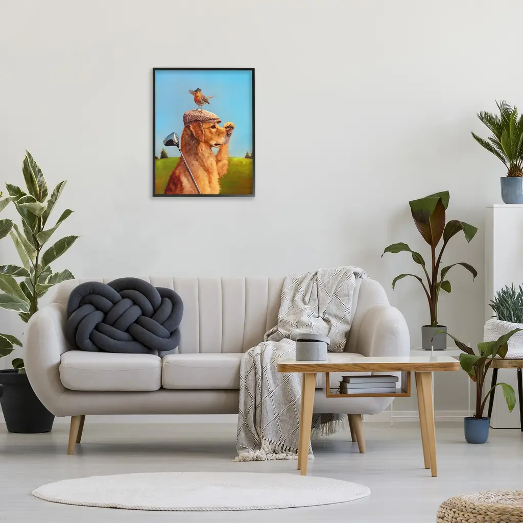 Add dimension to any room with our textured Framed Giclee Artwork. Our framed artwork is securely mounted into a 1.5-inch thick wood grain frame and ready to hang. Frames are available in three alluring styles: black, gray farmhouse and white. In addition, you should check out our oversized options if you want a statement piece. Stupell Wall Art is made in the USA.Features: Dimensions: 11 x 1.5 x 14 FramedFramed Giclee Products are available in the sizes 11"x14", 16"x20" or 24"x30". All Framed Giclee Products have a 1.5" Depth. Wall Art is Ready to Hang with Hardware Free Hanging. No installation required. For Easy Set Up Lean or Layer Artwork on Shelf or Against Wall.Our giclée prints are carefully mounted on a durable MDF backing, and then perfectly finished in a 1.5 inch thick woodgrain frame. Mounted frame colors include black, gray farmhouse and white. Made In USA.Artwork Relates To: Animal, Bird, Canine, Dog, Mammal, Pet, Golden Retriever, Golf, Golfing, Sport, LandscapeDesign by Lucia Heffernan