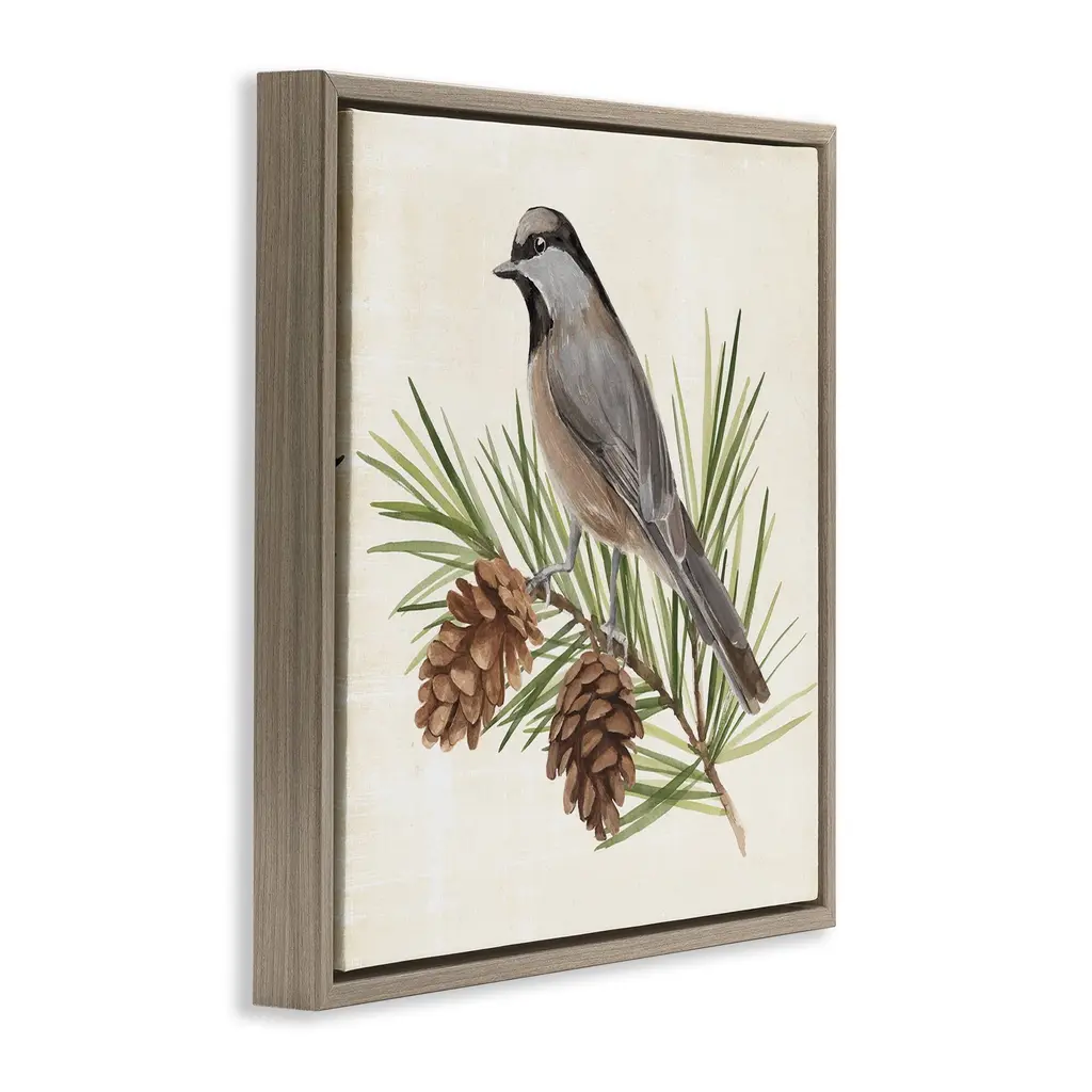 Elevate your home or office to the next level with Stupell Framed Floating Canvas Wall Art. Our premium hand-stretched canvas is mounted securely into a sturdy lightweight frame. The museum-style gap between the wrapped canvas and the box frame gives the illusion of floating artwork. Stupell Wall Art is made in the USA.Features: Dimensions: 18 x 1.7 x 18 Frame, 17 x 1.5 x 17 Canvas ArtFloating Frame Canvas Products are available in sizes 18"x18" and 25"x25". All Floating Frame Canvas Products have a 1.7" Depth.Wall Art is Ready to Hang with Hardware Free Hanging. No Installation required. For Easy Set Up Lean or Layer Artwork on Shelf or Against Wall. Artwork is Permently Fixed into the Frame.Our elevated 1.7" Thick Floating Frame is the perfect complement to our canvas style Wall Art. We use only the highest quality inks in house with industry leading printing solutions. Canvas is hand stretched over a durable wood foundation and then mounted securly into a Modern Box Frame. Made in the USA.Artwork Relates To: Plant, Tree, Conifer, Animal, Bird, Jay, Finch, Wren, Sparrow, Pine, PineconeDesign by Annie Warren