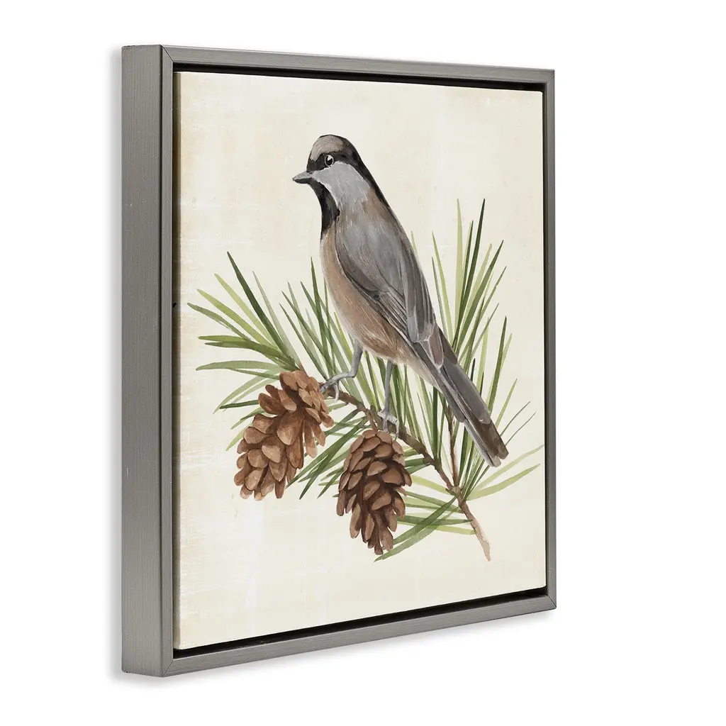 Elevate your home or office to the next level with Stupell Framed Floating Canvas Wall Art. Our premium hand-stretched canvas is mounted securely into a sturdy lightweight frame. The museum-style gap between the wrapped canvas and the box frame gives the illusion of floating artwork. Stupell Wall Art is made in the USA.Features: Dimensions: 18 x 1.7 x 18 Frame, 17 x 1.5 x 17 Canvas ArtFloating Frame Canvas Products are available in sizes 18"x18" and 25"x25". All Floating Frame Canvas Products have a 1.7" Depth.Wall Art is Ready to Hang with Hardware Free Hanging. No Installation required. For Easy Set Up Lean or Layer Artwork on Shelf or Against Wall. Artwork is Permently Fixed into the Frame.Our elevated 1.7" Thick Floating Frame is the perfect complement to our canvas style Wall Art. We use only the highest quality inks in house with industry leading printing solutions. Canvas is hand stretched over a durable wood foundation and then mounted securly into a Modern Box Frame. Made in the USA.Artwork Relates To: Plant, Tree, Conifer, Animal, Bird, Jay, Finch, Wren, Sparrow, Pine, PineconeDesign by Annie Warren