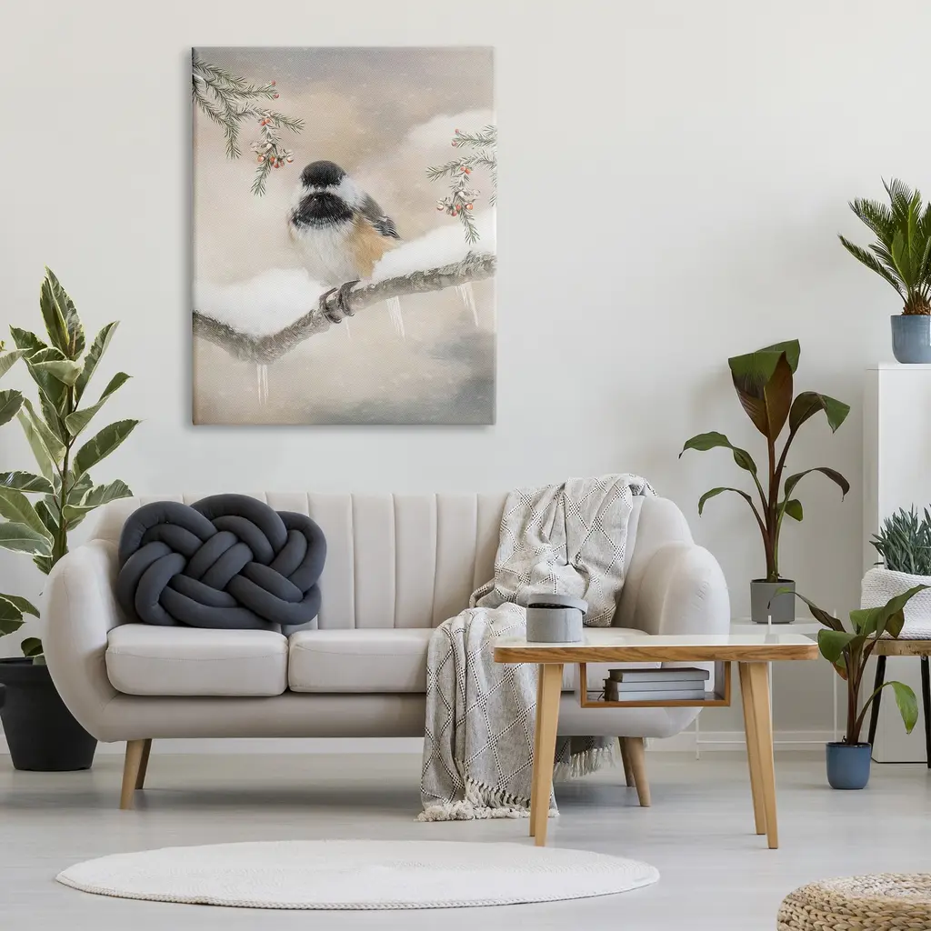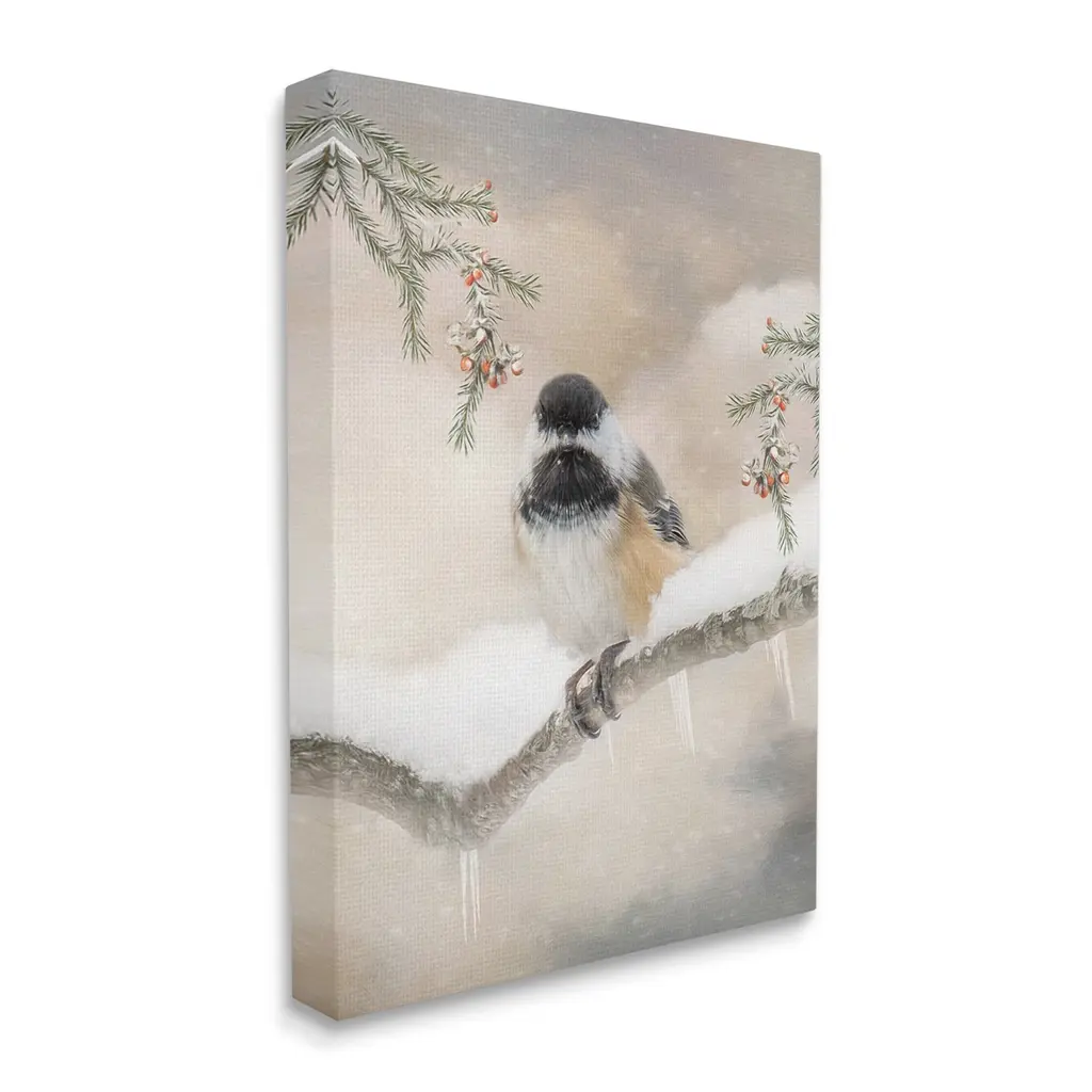 We create our stretched canvas to the highest standards. Using only the highest quality inks and canvas on Mimaki printers, we hand-cut and stretch each piece over a 1.5-inch thick wooden frame for hanging. As a result, the art comes ready to hang on the sturdy ledge with no installation required. Stupell Wall Art is made in the USA.Features: Dimensions: 16 x 1.5 x 20 InchesStretched Canvas Sizes Include Standard: 16 x 1.5 x 20 Large: 20 x 1.5 x 30 X-Large: 30 x 1.5 x 40 Oversized: 36 x 1.5 x 48Wall Art is Ready to Hang with Hardware Free Hanging. No installation required. For Easy Set Up Lean or Layer Artwork on Shelf or Against Wall.Our stretched canvas is created with the highest standards. We use only the highest quality inks and canvas on our in house Mimaki printers, and then hand cut and stretch each piece over a 1.5 inch thick wooden frame for hanging. Made In USA.Artwork Relates To: Nature, Animal, Bird, Winter, Plant, Tree, Snow, Conifer, FinchDesign by Kelley Parker