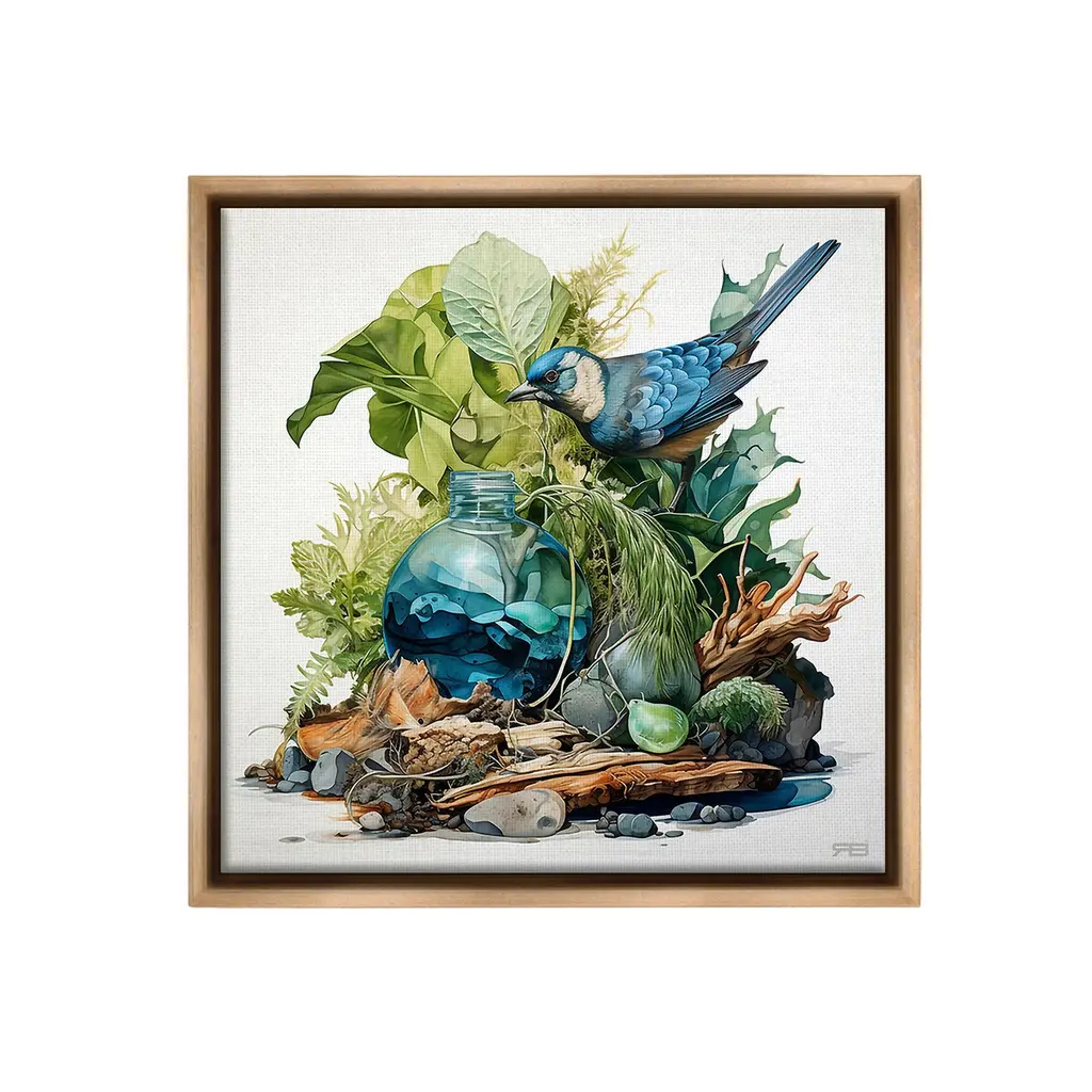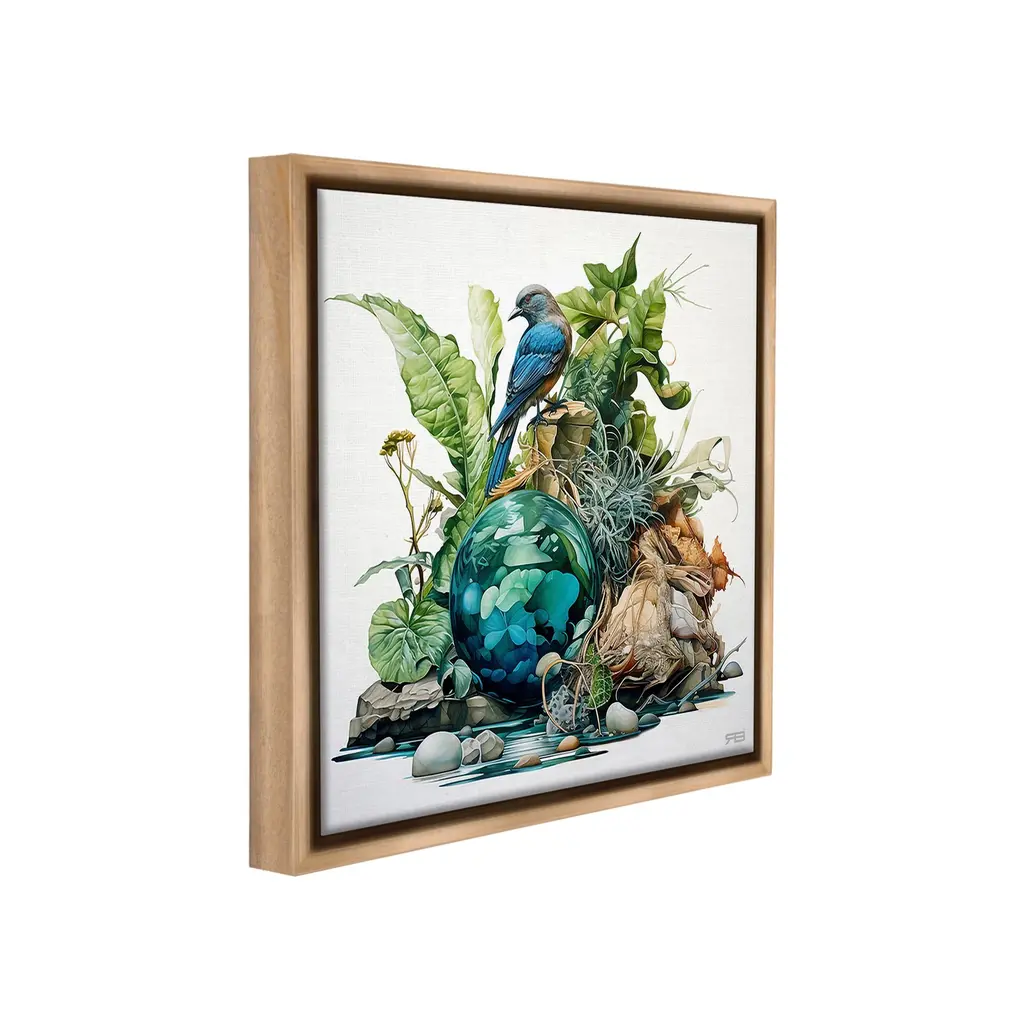 Elevate your home or office to the next level with Stupell Framed Floating Canvas Wall Art. Our premium hand-stretched canvas is mounted securely into a sturdy lightweight frame. The museum-style gap between the wrapped canvas and the box frame gives the illusion of floating artwork. Stupell Wall Art is made in the USA.Features: Dimensions: 18 x 1.7 x 18 Frame, 17 x 1.5 x 17 Canvas ArtFloating Frame Canvas Products are available in sizes 18"x18" and 25"x25". All Floating Frame Canvas Products have a 1.7" Depth.Wall Art is Ready to Hang with Hardware Free Hanging. No Installation required. For Easy Set Up Lean or Layer Artwork on Shelf or Against Wall. Artwork is Permently Fixed into the Frame.Our elevated 1.7" Thick Floating Frame is the perfect complement to our canvas style Wall Art. We use only the highest quality inks in house with industry leading printing solutions. Canvas is hand stretched over a durable wood foundation and then mounted securly into a Modern Box Frame. Made in the USA.Artwork Relates To: Animal, Bird, Jay, Blue Jay, Bluebird, Botanical, Woodland, LeafDesign by RB
