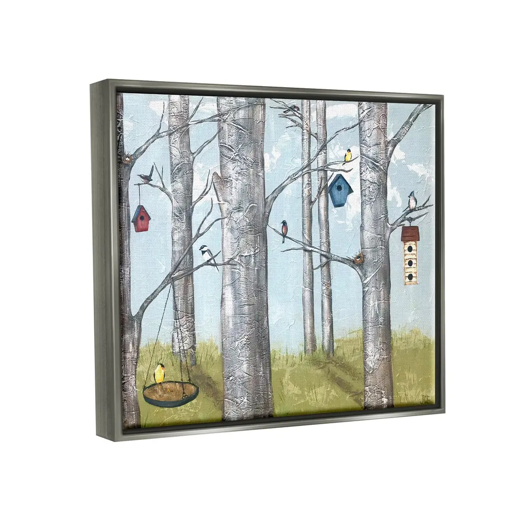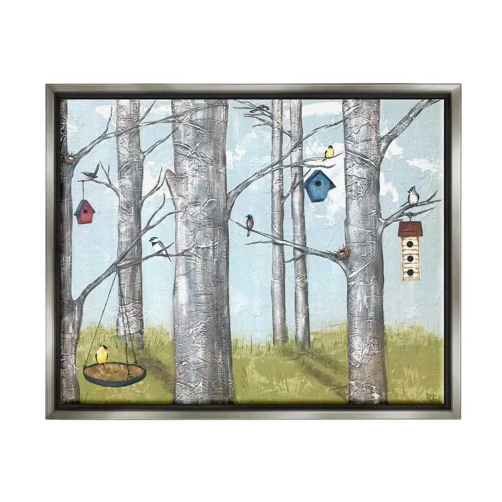 Elevate your home or office to the next level with Stupell Framed Floating Canvas Wall Art. Our premium hand-stretched canvas is mounted securely into a sturdy lightweight frame. The museum-style gap between the wrapped canvas and the box frame gives the illusion of floating artwork. Stupell Wall Art is made in the USA.Features: Dimensions: 21 x 1.7 x 17 Frame, 20 x 1.5 x 16 Canvas ArtFloating Frame Sizes Include Standard: 21 x 1.7 x 17 Oversized: 31 x 1.7 x 25Wall Art is Ready to Hang - No Installation or Hardware Needed. For Easy Set Up Lean or Layer Artwork on Shelf or Against Wall.Our elevated 1.7" Thick Floating Frame is the perfect complement to our canvas style Wall Art. We use only the highest quality inks in house with industry leading printing solutions. Canvas is hand stretched over a durable wood foundation and then mounted securly into a Modern Box Frame. Made in the USA.Artwork Relates To: Plant, Tree, Animal, Bird, Vegetation, Painting, Nature, Woodland, Bird Feeder, BirchDesign by Jade Reynolds