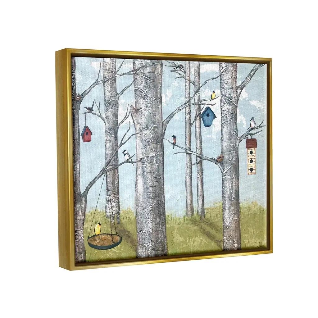 Stupell Birdhouses Woodland Birch Trees Framed Floater Canvas Wall Art By Jade Reynolds - 30 X 24 - Gold