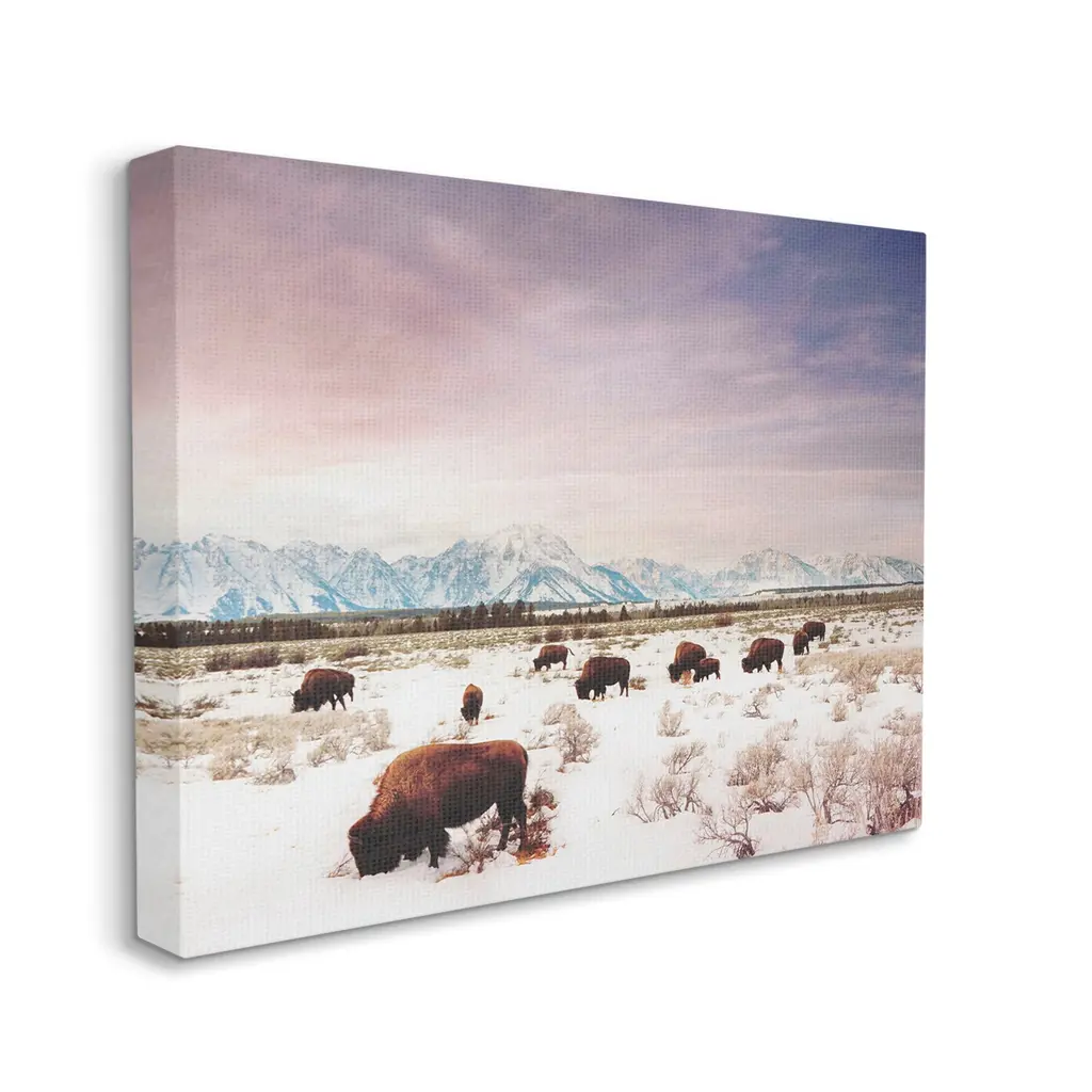 We create our stretched canvas to the highest standards. Using only the highest quality inks and canvas on Mimaki printers, we hand-cut and stretch each piece over a 1.5-inch thick wooden frame for hanging. As a result, the art comes ready to hang on the sturdy ledge with no installation required. Stupell Wall Art is made in the USA.Features: Dimensions: 20 x 1.5 x 16 InchesStretched Canvas Sizes Include Standard: 20 x 1.5 x 16 Large: 30 x 1.5 x 20 X-Large: 40 x 1.5 x 30 Oversized: 48 x 1.5 x 36Wall Art is Ready to Hang with Hardware Free Hanging. No installation required. For Easy Set Up Lean or Layer Artwork on Shelf or Against Wall.Our stretched canvas is created with the highest standards. We use only the highest quality inks and canvas on our in house Mimaki printers, and then hand cut and stretch each piece over a 1.5 inch thick wooden frame for hanging. Made In USA.Artwork Relates To: Animal, Buffalo, Mammal, Wildlife, Bison, Nature, MountainDesign by Annie Bailey Art