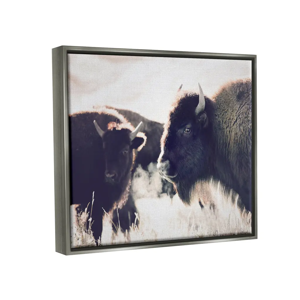 Elevate your home or office to the next level with Stupell Framed Floating Canvas Wall Art. Our premium hand-stretched canvas is mounted securely into a sturdy lightweight frame. The museum-style gap between the wrapped canvas and the box frame gives the illusion of floating artwork. Stupell Wall Art is made in the USA.Features: Dimensions: 21 x 1.7 x 17 Frame, 20 x 1.5 x 16 Canvas ArtFloating Frame Sizes Include Standard: 21 x 1.7 x 17 Oversized: 31 x 1.7 x 25Wall Art is Ready to Hang with Hardware Free Hanging. No installation required. For Easy Set Up Lean or Layer Artwork on Shelf or Against Wall.Our elevated 1.7" Thick Floating Frame is the perfect complement to our canvas style Wall Art. We use only the highest quality inks in house with industry leading printing solutions. Canvas is hand stretched over a durable wood foundation and then mounted securly into a Modern Box Frame. Made in the USA.Artwork Relates To: Animal, Mammal, Wildlife, Bison, Nature, LandscapeDesign by Sisi and Seb