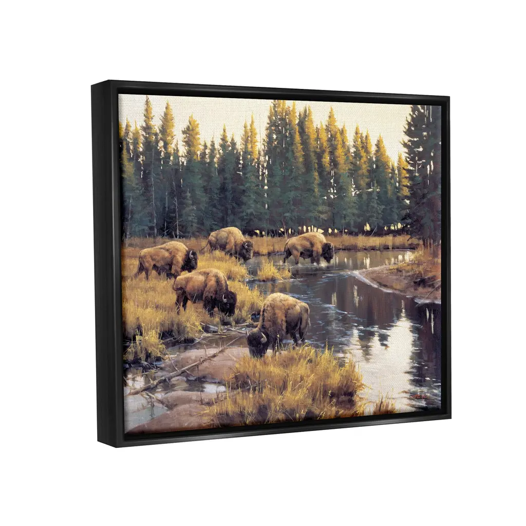 Elevate your home or office to the next level with Stupell Framed Floating Canvas Wall Art. Our premium hand-stretched canvas is mounted securely into a sturdy lightweight frame. The museum-style gap between the wrapped canvas and the box frame gives the illusion of floating artwork. Stupell Wall Art is made in the USA.Features: Dimensions: 21 x 1.7 x 17 Frame, 20 x 1.5 x 16 Canvas ArtFloating Frame Sizes Include Standard: 21 x 1.7 x 17 Oversized: 31 x 1.7 x 25Wall Art is Ready to Hang - No Installation or Hardware Needed. For Easy Set Up Lean or Layer Artwork on Shelf or Against Wall.Our elevated 1.7" Thick Floating Frame is the perfect complement to our canvas style Wall Art. We use only the highest quality inks in house with industry leading printing solutions. Canvas is hand stretched over a durable wood foundation and then mounted securly into a Modern Box Frame. Made in the USA.Artwork Relates To: Animal, Mammal, Buffalo, Wildlife, Plant, Tree, Nature, Scenery, Bison, Water, Landscape, Countryside, GrazingDesign by Paco Young