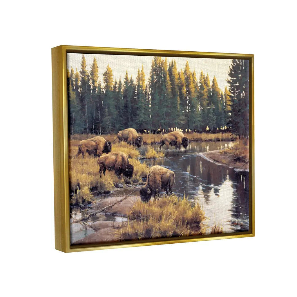 Stupell Bison Grazing Along Stream Framed Floater Canvas Wall Art By Paco Young - 30 X 24 - Gold